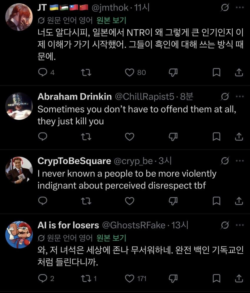 난 일개 조센징이지만 조센징의 상위종이자 동북아의 대표 인종인 스시녀가 니그로들한테 ntr 당하는 것에 대한 환상이 있음