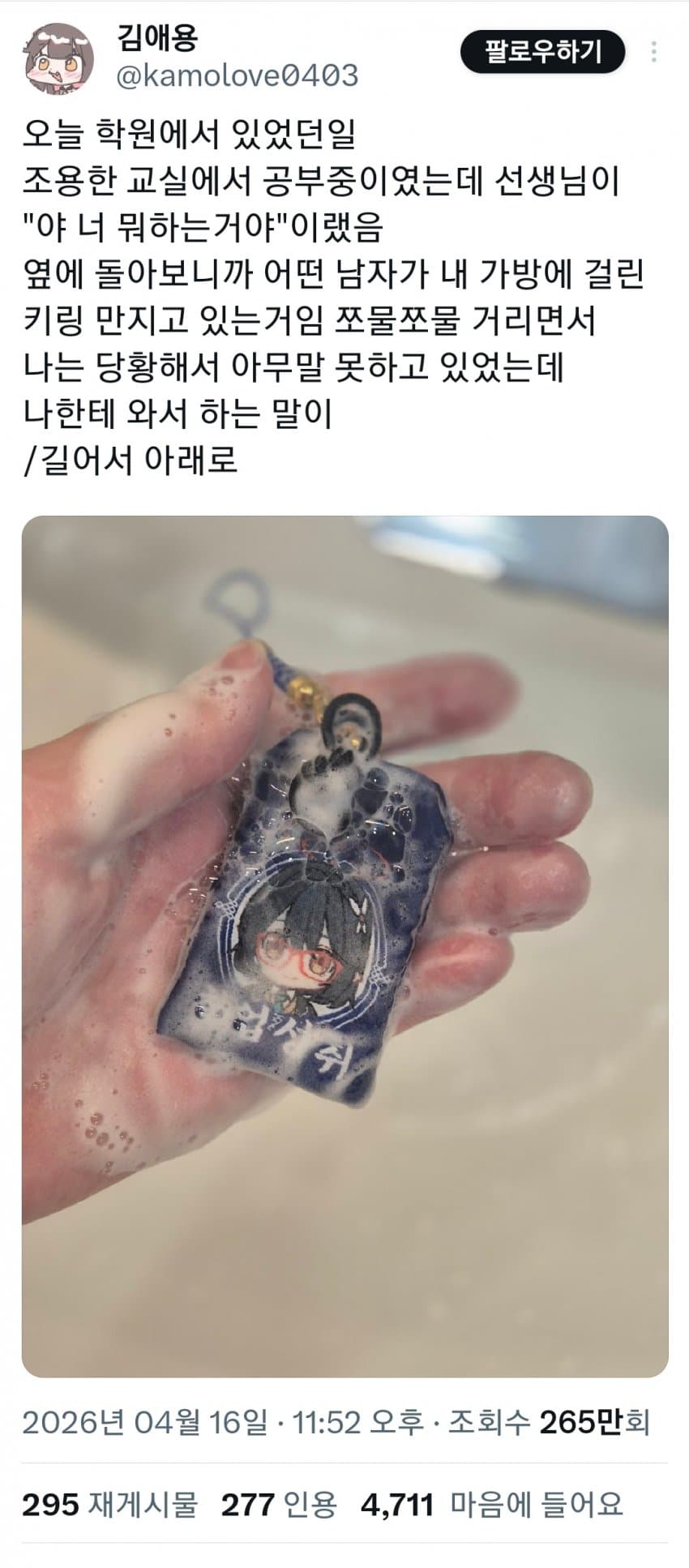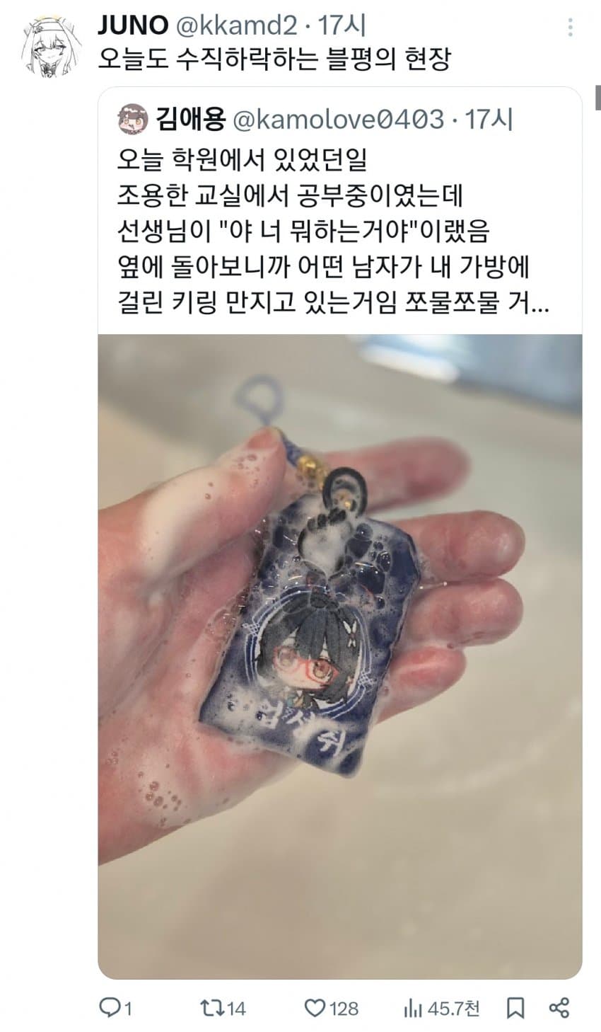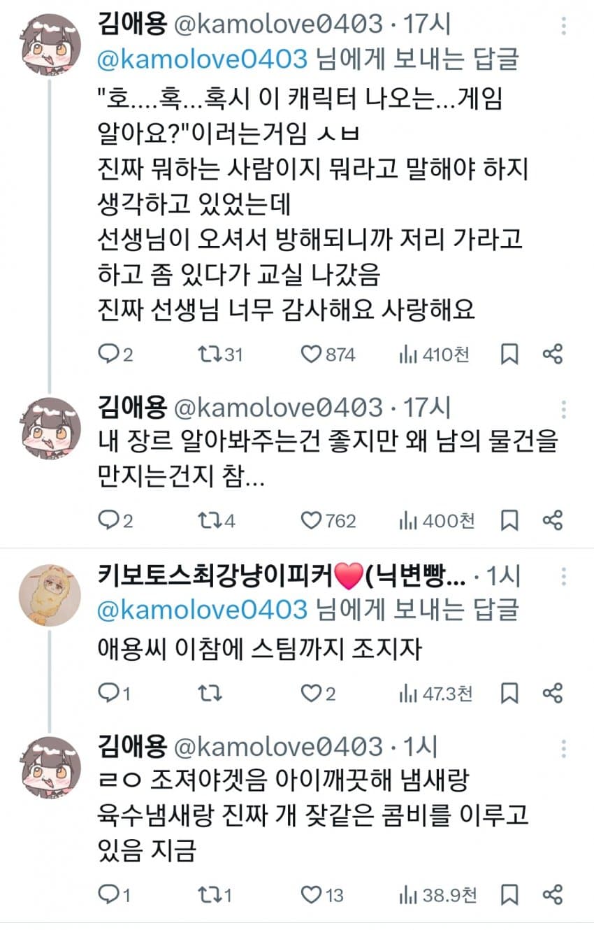사회성 떨어지는 블두순 수준보소 ㅋㅋ 친해지고 싶으면 수업 끝나고 인사부터 하든가타지에서 고향 사람 만난 상황처럼 저도 블두순이에요 하면서 급 친해지는 전개를 노렸던거냐? ㅋㅋㅋㅋ