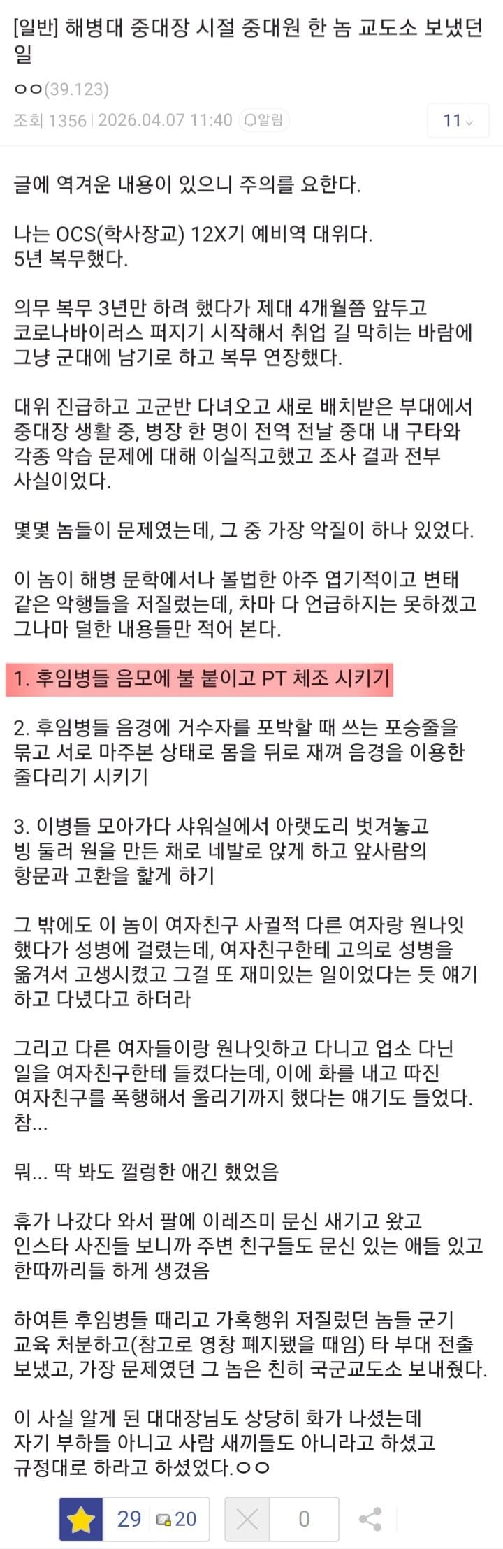 아무리 군대라도 저런걸 순순히 당해주는 마인드 자체가 이해가 안감..고자되기vs쌍방으로 징계받기 인데 후자가 낫지 않나