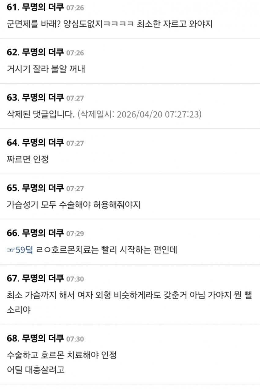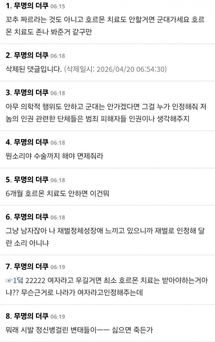 뭐 호르몬은 받아야지 나 여자요 말로만해서 공익가는게 말이되나 음음