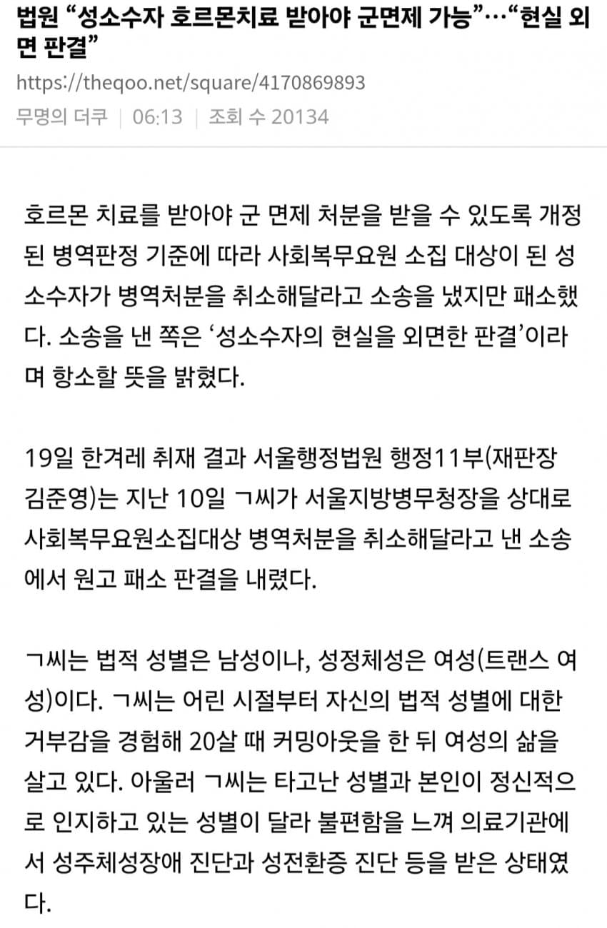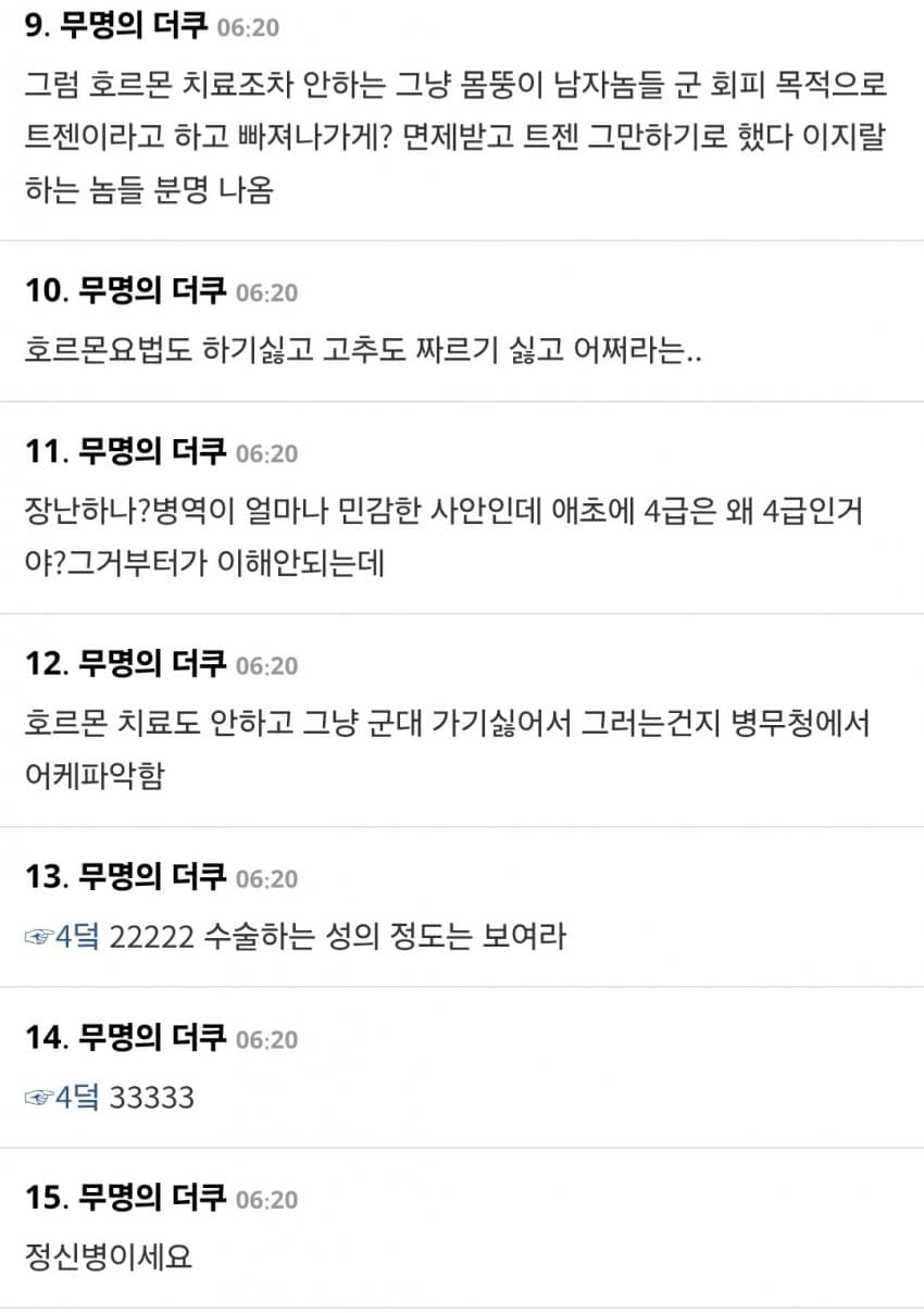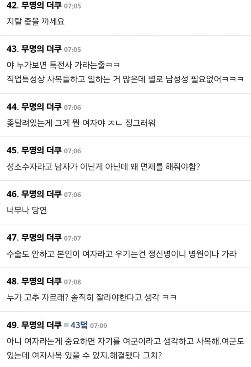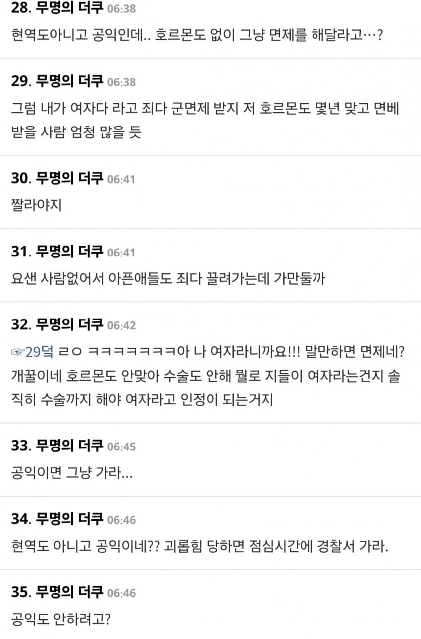 야추 멀쩡하고 호르몬 요법도 안받으면서 면제 해달라는건 ㅅㅂ 양심이 없노 ㅋㅋㅋ