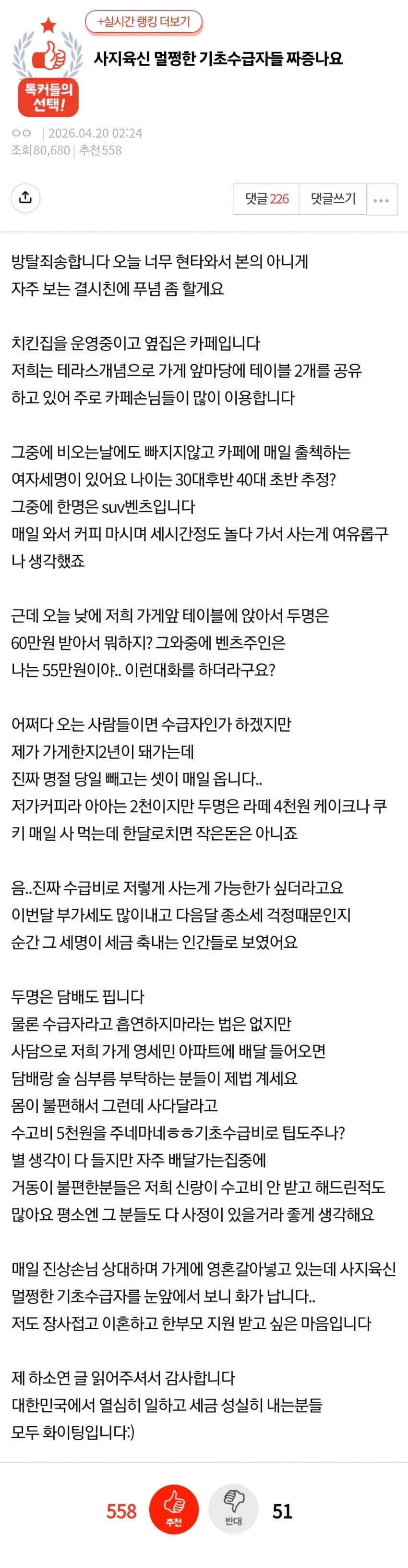 다른걸 떠나서 수급자가 진짜 "정상적인"생활을 하겠냐.. 모든 쾌락 포기하고 생존만 하는거지