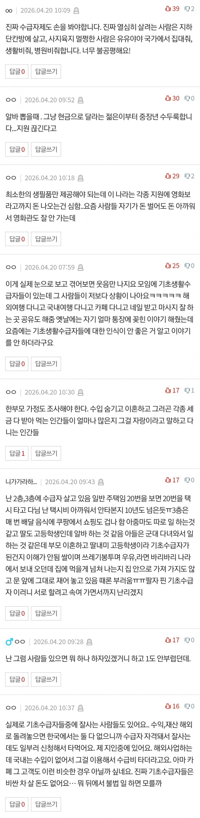 원 판글도 그렇고 여기도 비추수 꽤 많고발작하는 댓글도 간간히 보이는 거 보니 아주 투명하노진짜 날잡고 가짜 수급자들 확 조져야 함