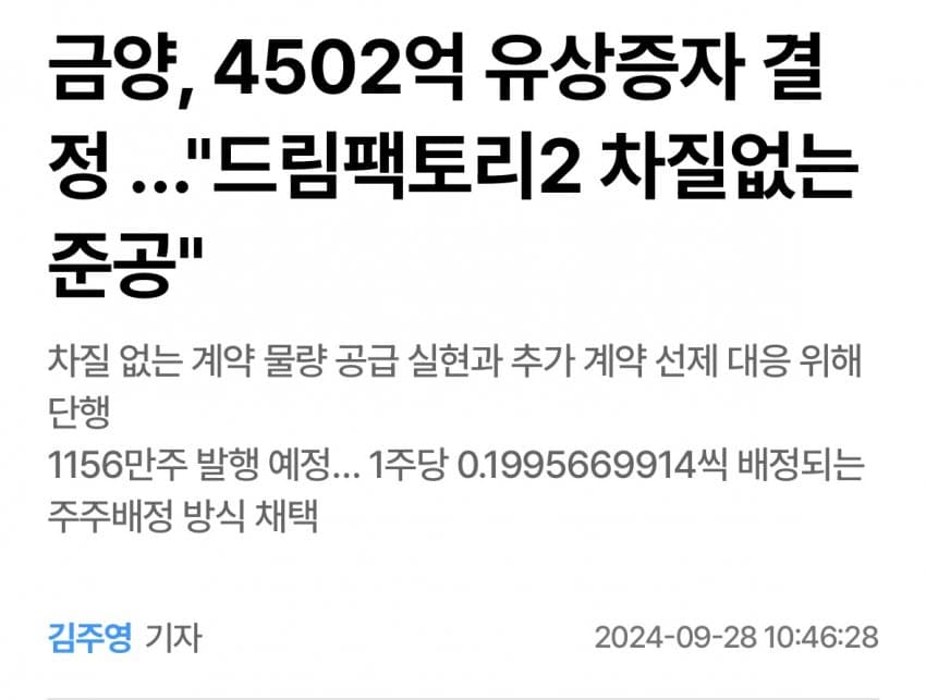 9월 27일, 금양이 돈없다고 유상증자를 공시한것이다.