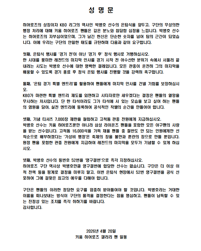 키움히어로즈 갤러리 성명문 - [박병호 은퇴식]