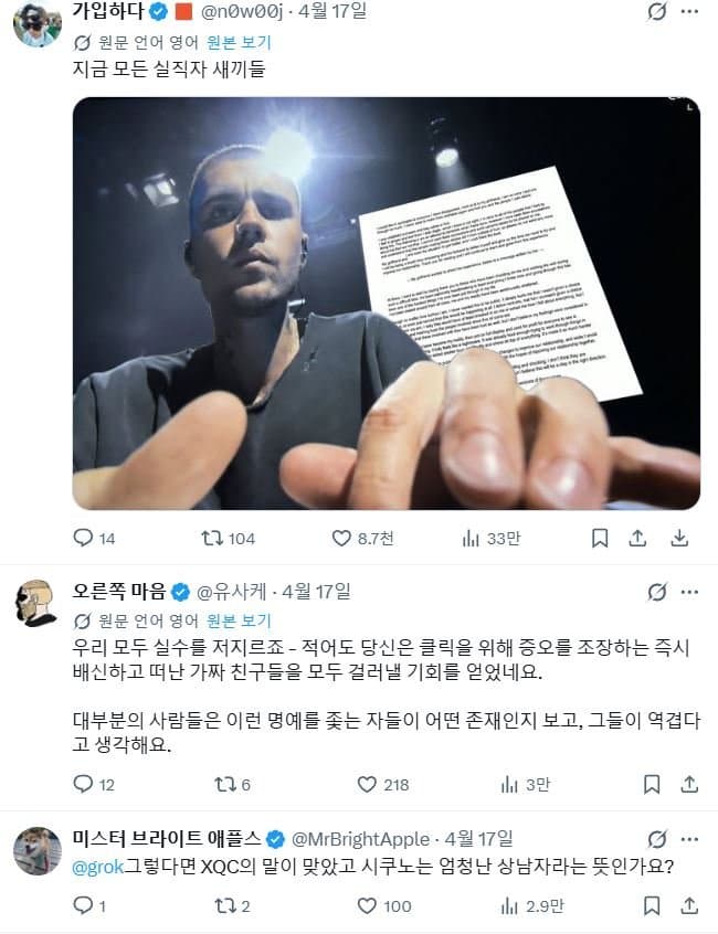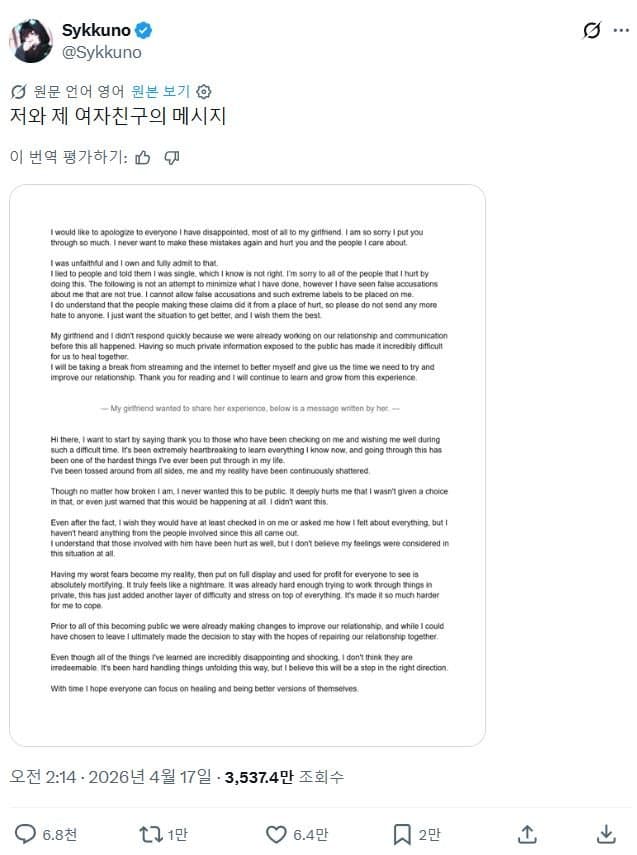 사과문을 올렸는데 여자친구가 자신의 행동을 용서했고 당분간 스트리밍을 그만두고 같이 여행을 간다는 내용임