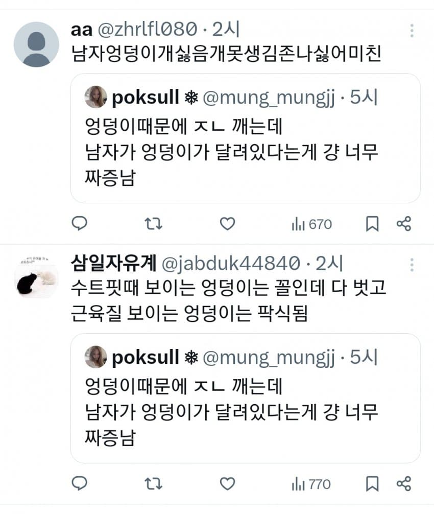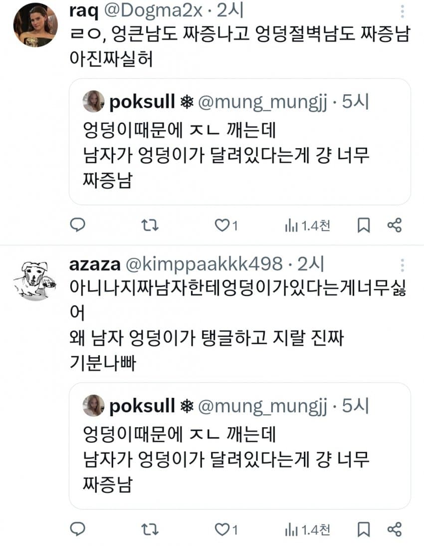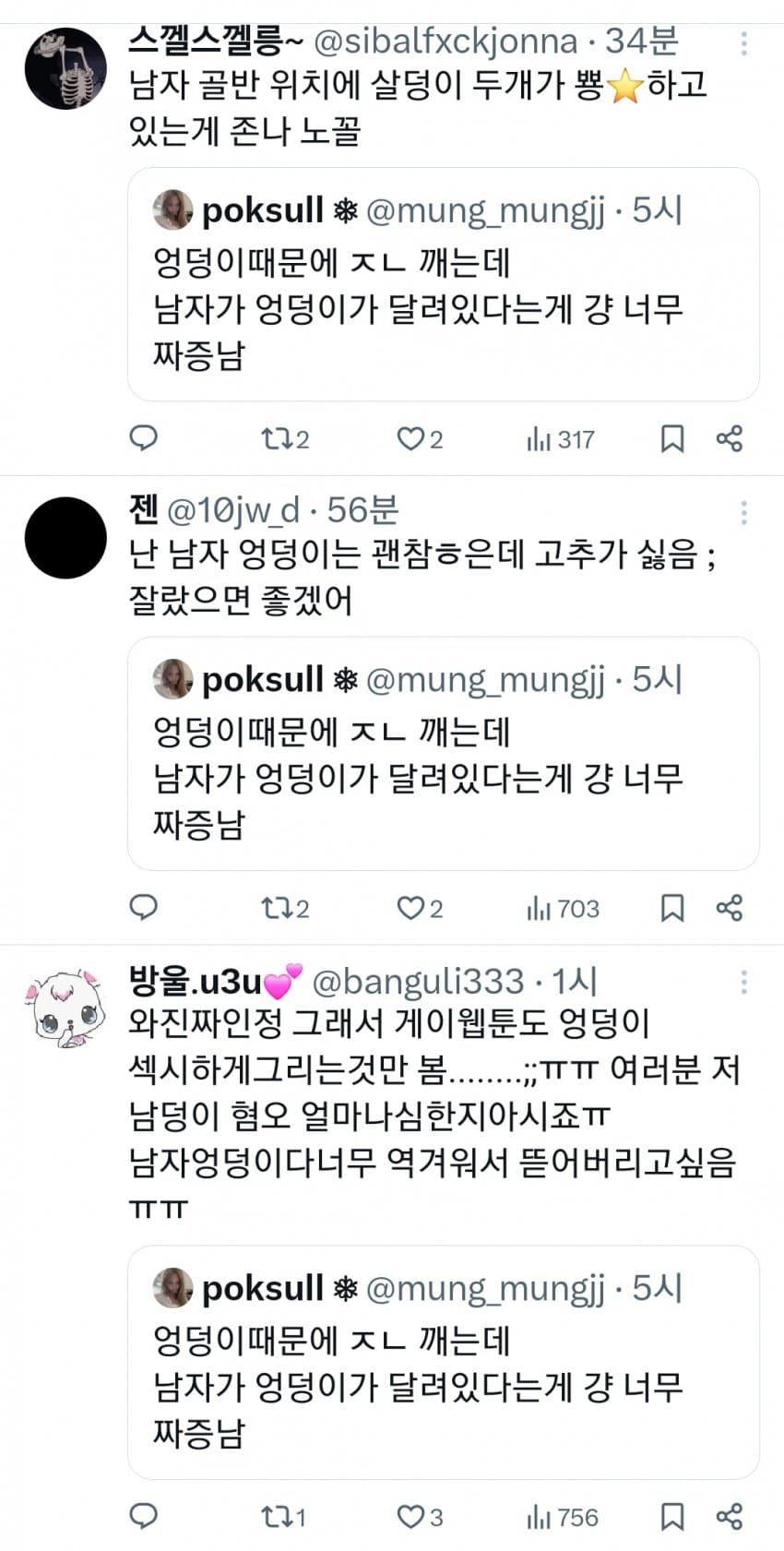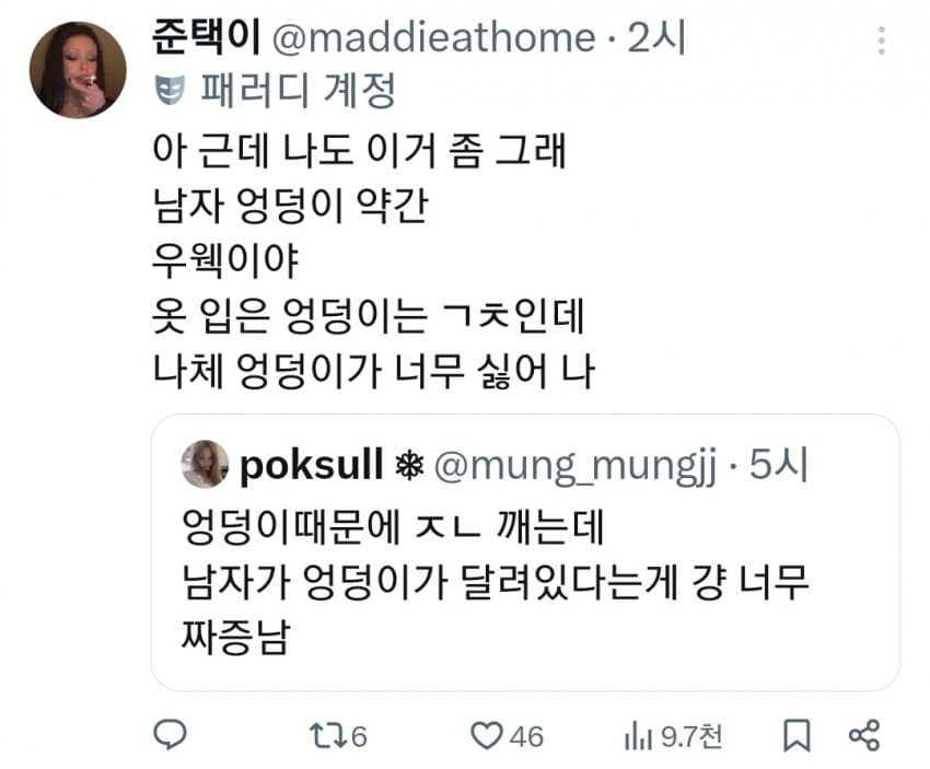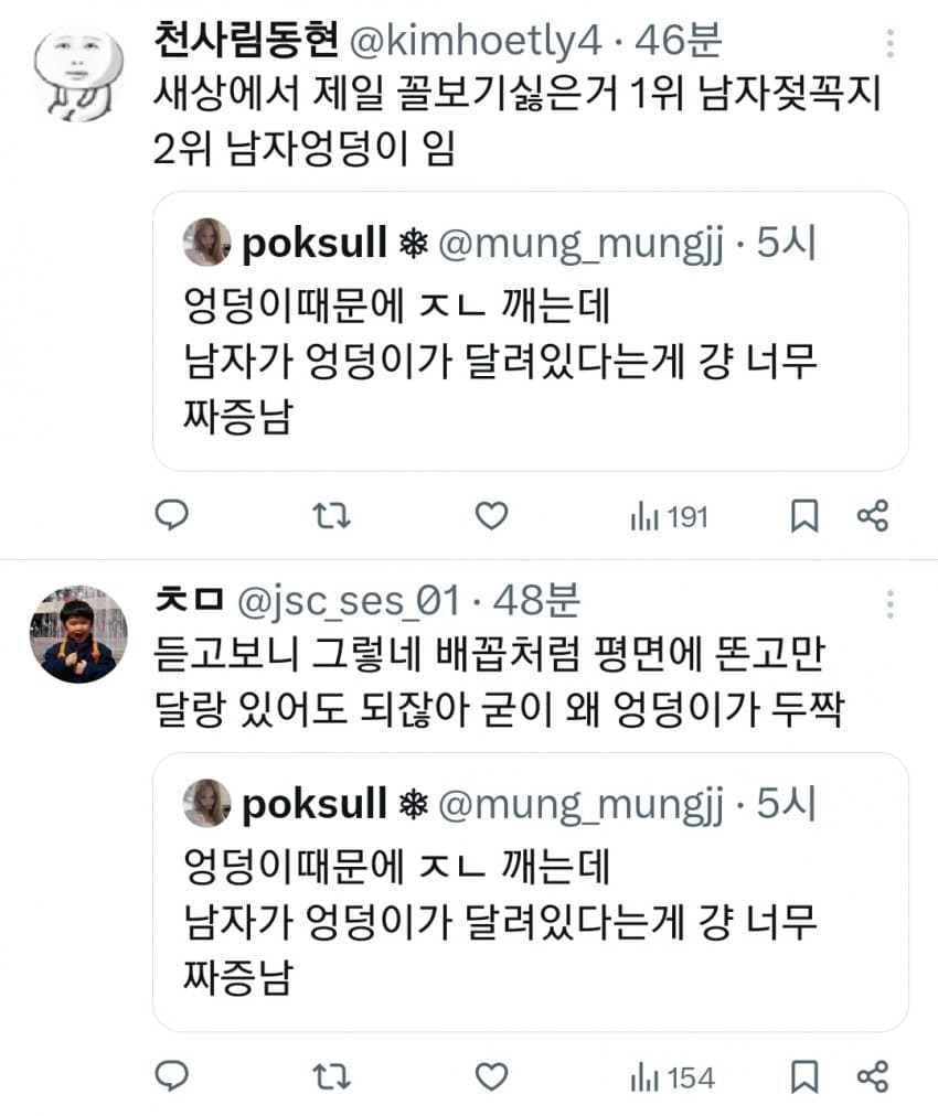 트위터 남혐하는 애들은 10대나 20대라 그럼. 노괴되면 남자 엉덩이 힙업된거 좋아함