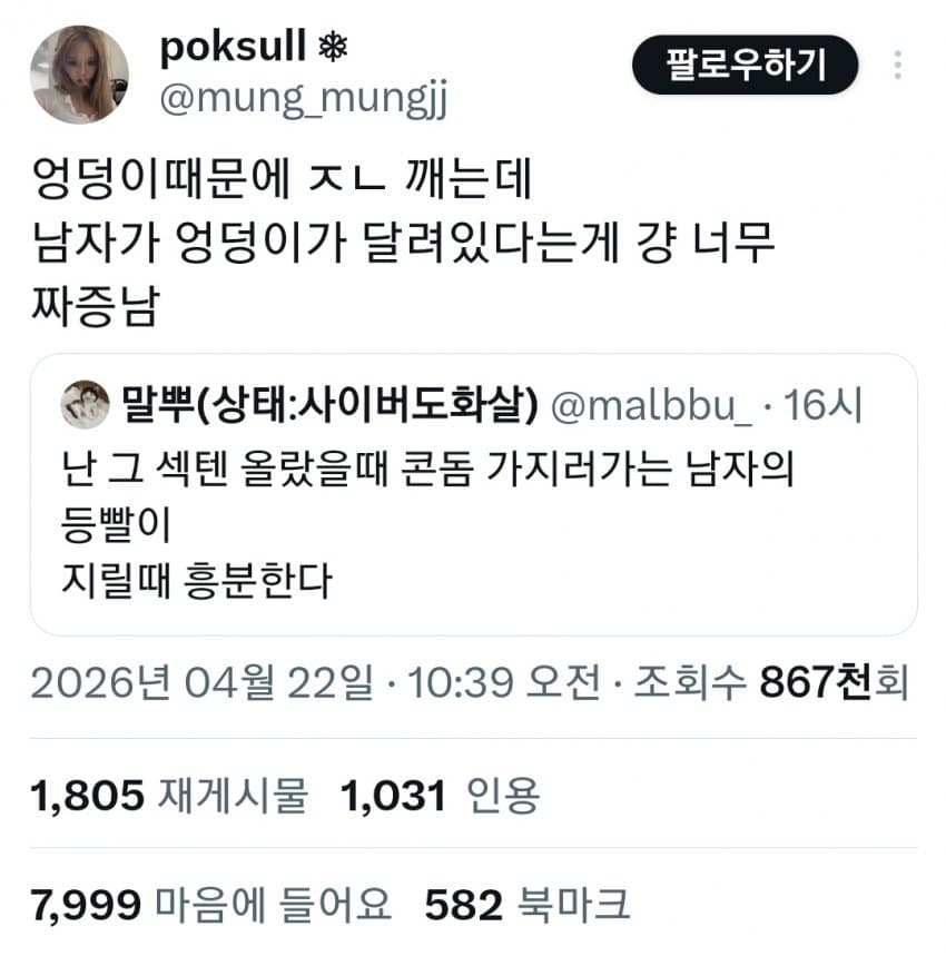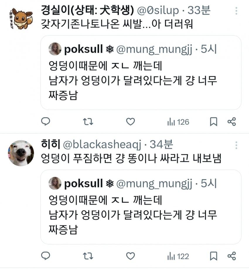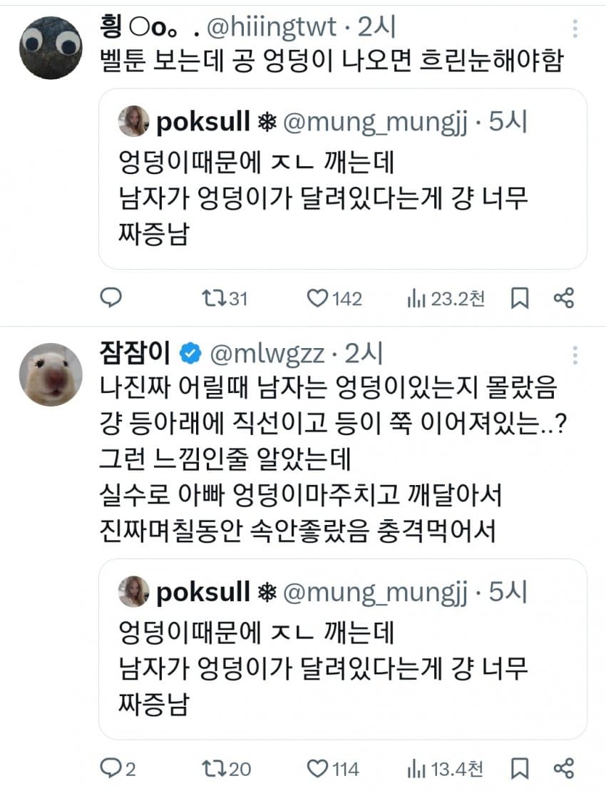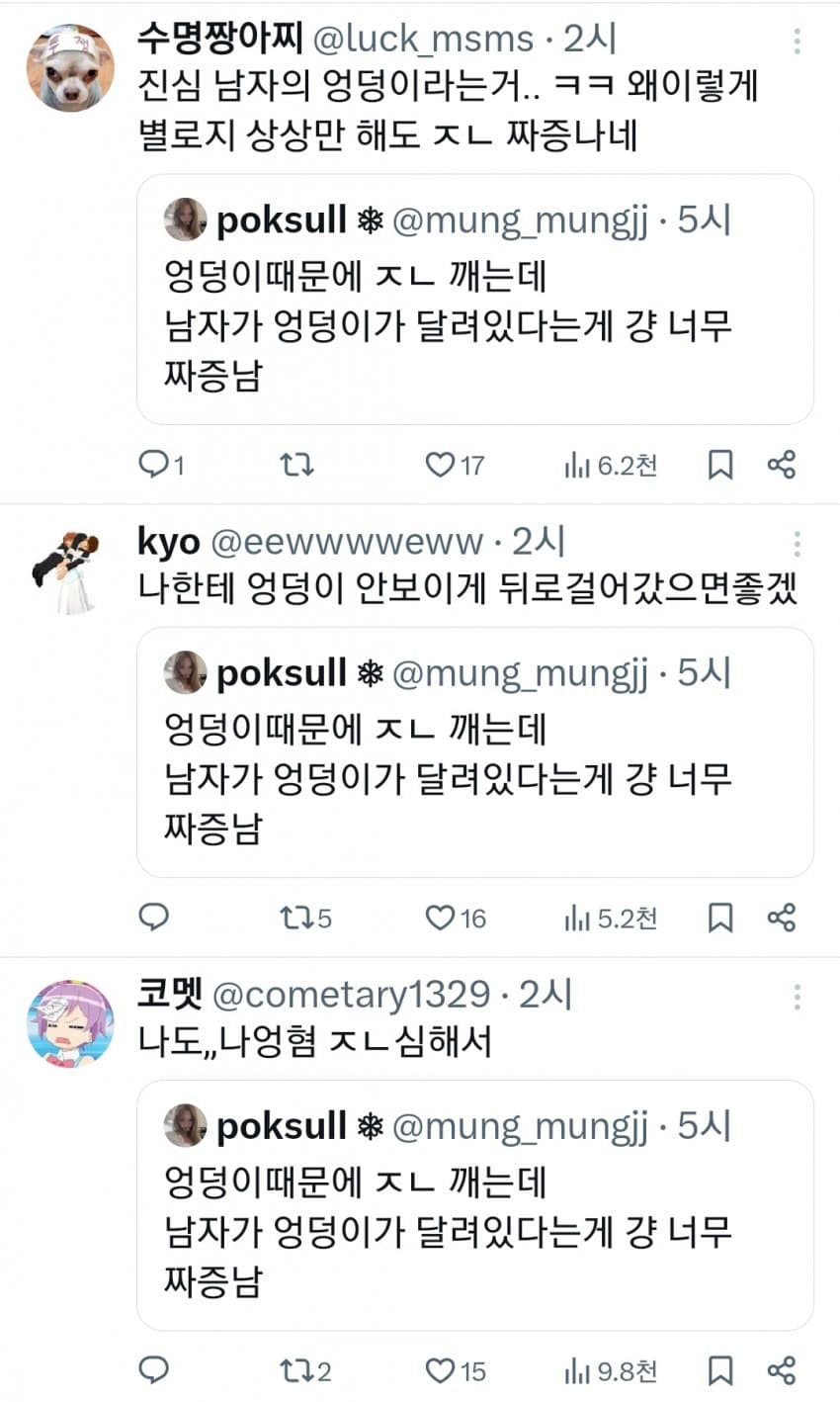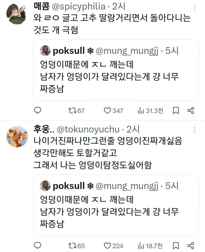 트위터 남혐하는 애들은 10대나 20대라 그럼. 노괴되면 남자 엉덩이 힙업된거 좋아함