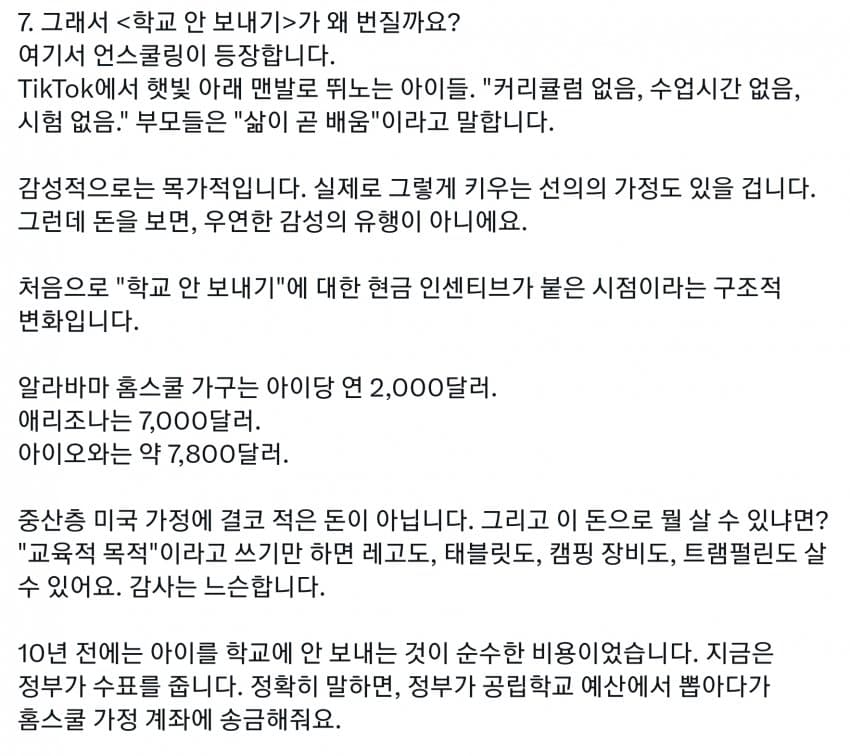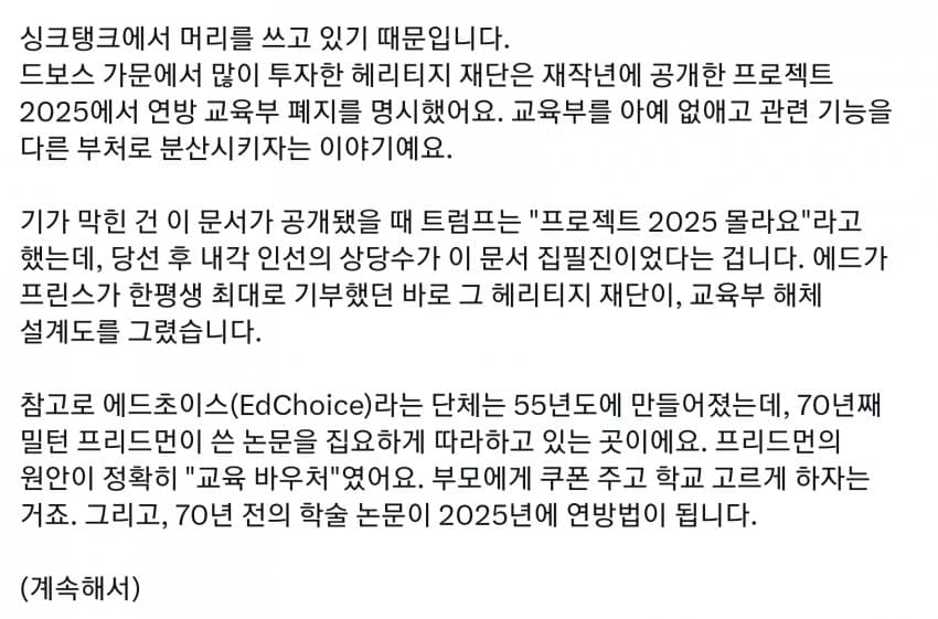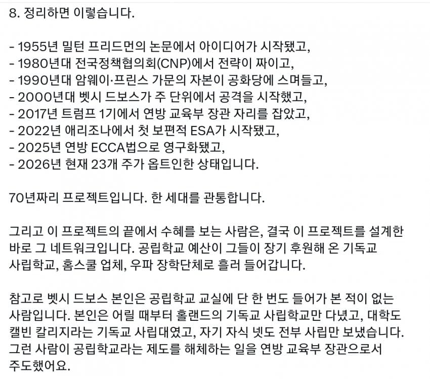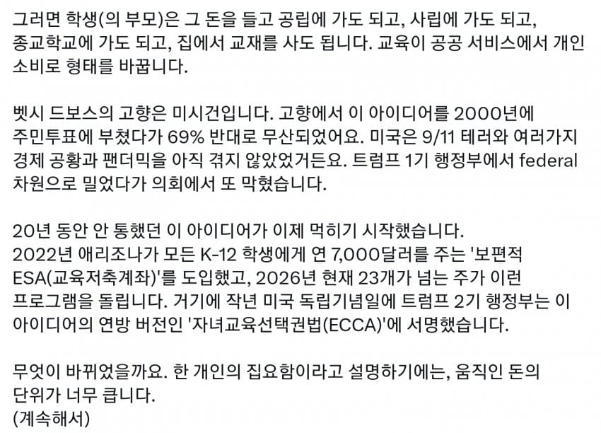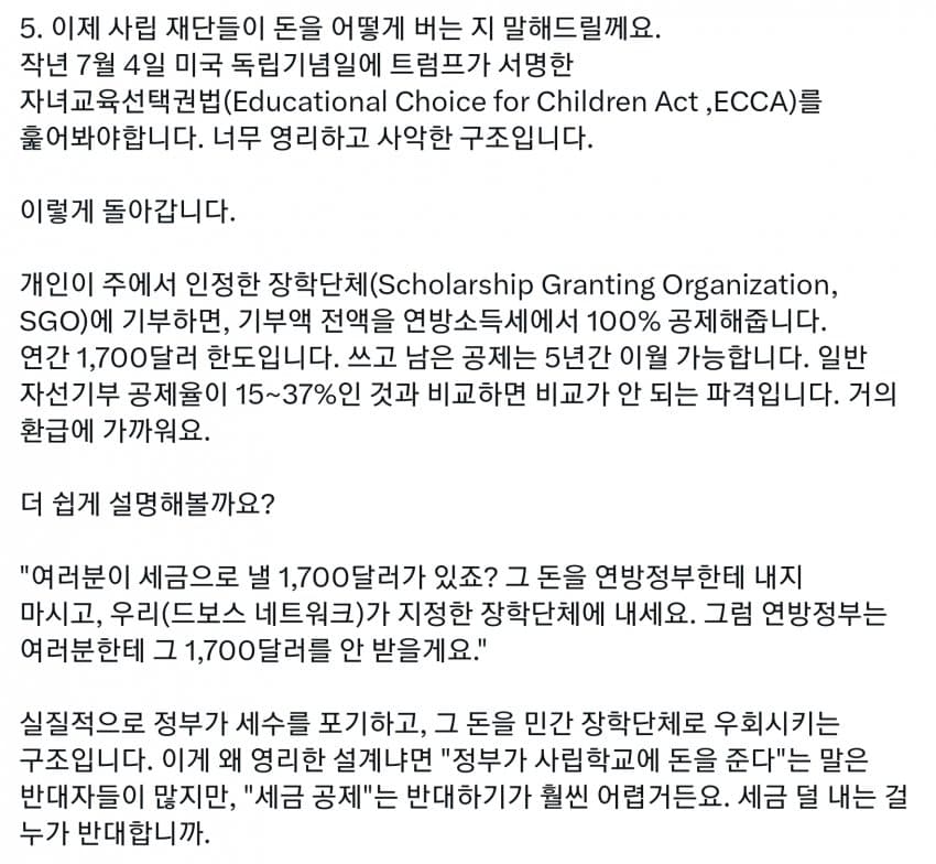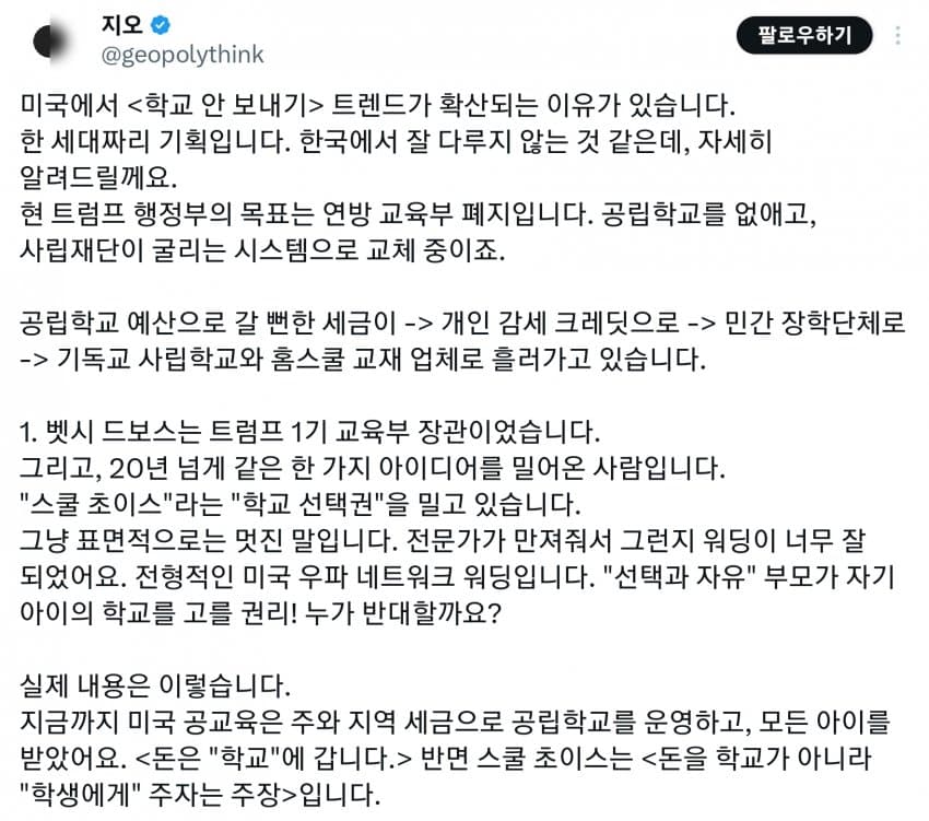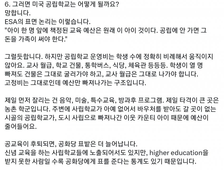 미국도 세금의 99%는 상위 몇프로가 다 내는데, 그런 상류층이 사립을 보내니 공립은 돈도 없고 저임금이라 선생들이 저임금 PC충들로 채워짐. 다른 직장에서는 일할 수 있는 정신상태가 아닌 사람들이 아직 어린 학생들을 가르치면 인간의 성이 수십개라느니 왜곡된 사상을 가진 세대를 양산하기 시작. 일론 아들도 이거에 당해서 미성년자 때 여성으로 성전환. 부모들은 자기 자식들이 PC충들에게 이상한 교육 받는지도 모르고 방치해버림. 결국 이런 무능력하고 악의 구렁텅이가 되어버린 공립학교는 없애고 각자 가르치는게 낫다로 가는 거임. 요즘 온라인 코스도 훌륭하고 부모가 홈스쿨링하는게 낫지. 어차피 나라를 이끌 엘리트들은 다 사립다니는데 이상한 공교육을 방치해버렸다가 나라가 밑둥부터 썩기 시작해버렸지