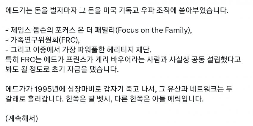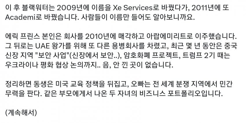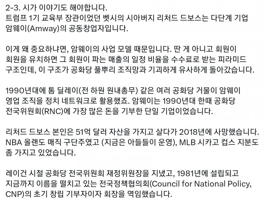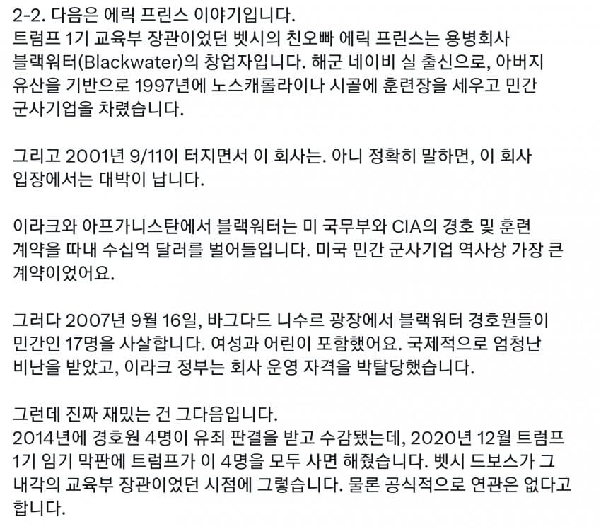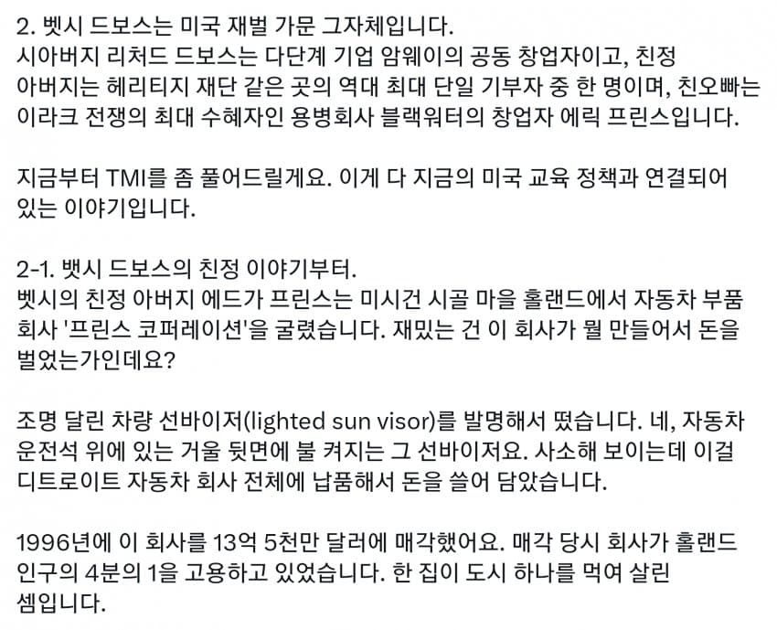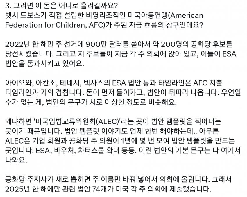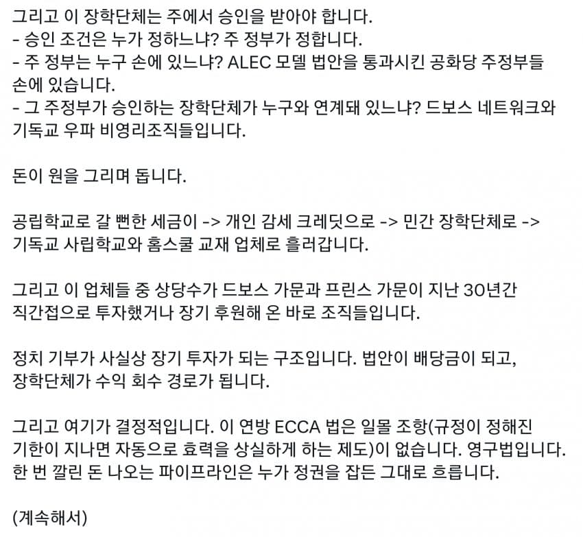 미국도 세금의 99%는 상위 몇프로가 다 내는데, 그런 상류층이 사립을 보내니 공립은 돈도 없고 저임금이라 선생들이 저임금 PC충들로 채워짐. 다른 직장에서는 일할 수 있는 정신상태가 아닌 사람들이 아직 어린 학생들을 가르치면 인간의 성이 수십개라느니 왜곡된 사상을 가진 세대를 양산하기 시작. 일론 아들도 이거에 당해서 미성년자 때 여성으로 성전환. 부모들은 자기 자식들이 PC충들에게 이상한 교육 받는지도 모르고 방치해버림. 결국 이런 무능력하고 악의 구렁텅이가 되어버린 공립학교는 없애고 각자 가르치는게 낫다로 가는 거임. 요즘 온라인 코스도 훌륭하고 부모가 홈스쿨링하는게 낫지. 어차피 나라를 이끌 엘리트들은 다 사립다니는데 이상한 공교육을 방치해버렸다가 나라가 밑둥부터 썩기 시작해버렸지