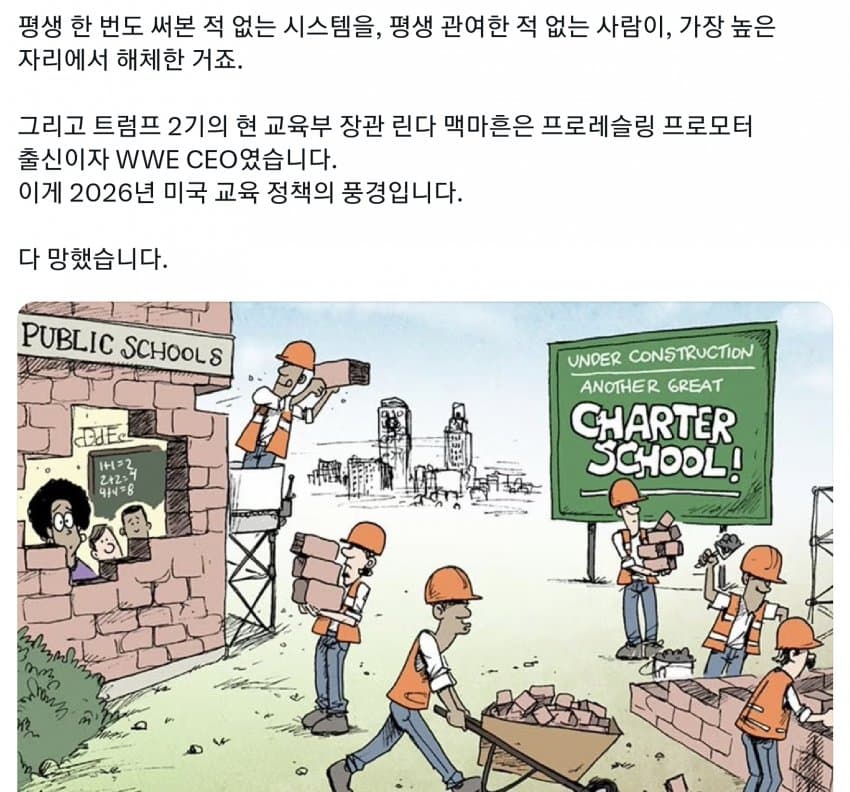 대충 트황상이 미국 공교육 정상화 시키고 있다는 말이네한국도 교육공무원들 못 때려 잡으면 미래없음