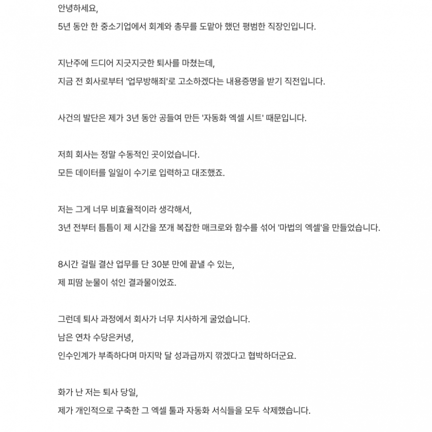 아니 그게 마법의 엑셀이고 통째로 삭제하면 당연히 노발대발 하지;;불법은 아니지만 굳이 긁어 부스럼 만든셈