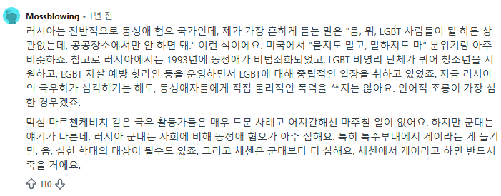 그리고 체첸의 동성애 혐오는 군대보다 더 심해서 거기서 게이짓하단 진짜 죽을수있음