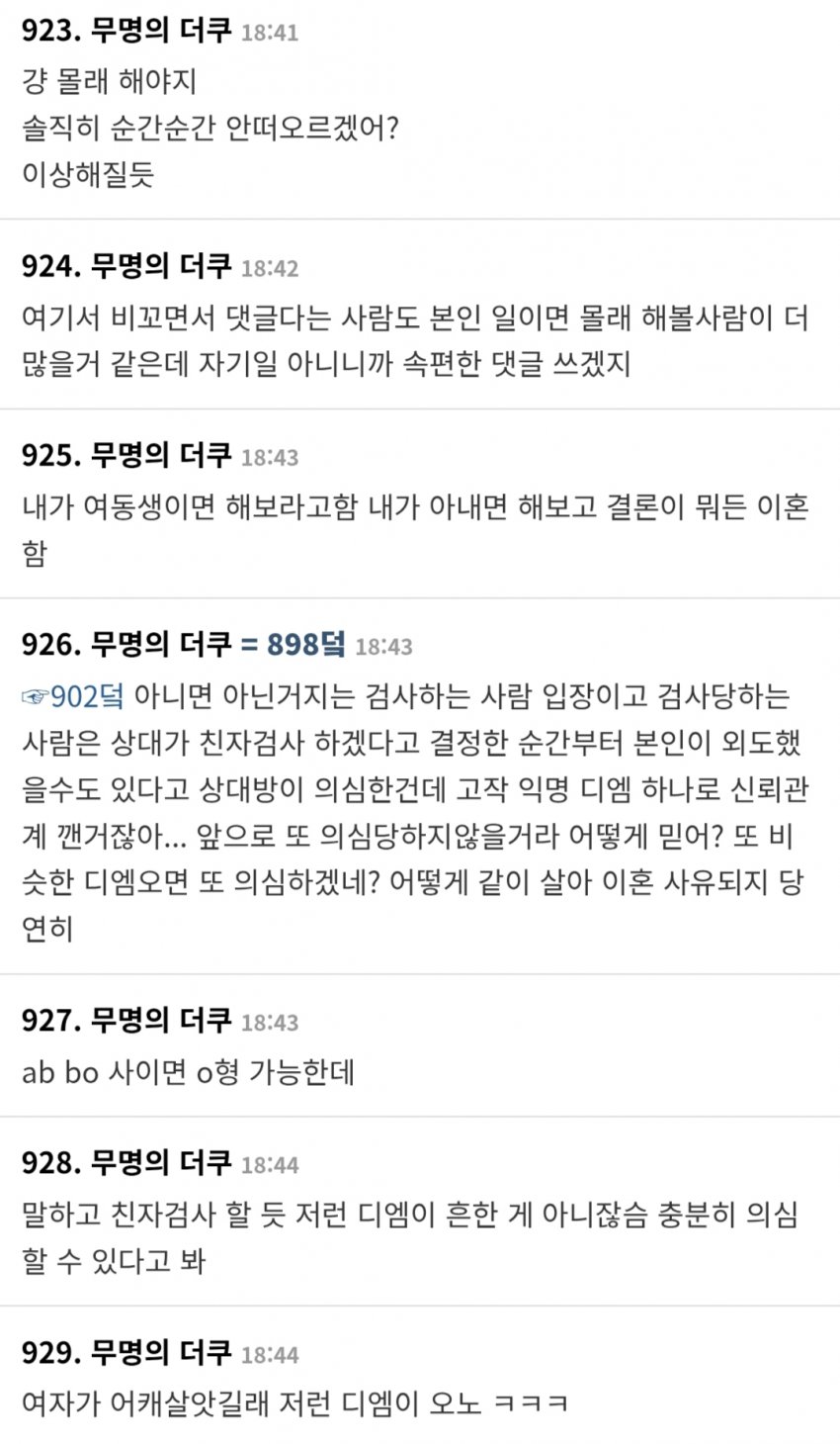 남동생있는 누나 입장에서 저상황이면 몰래하되 적극적으로 도와줄듯 ㅇㅇ 아니 시발 내동생이 뻐꾸기 당할 상황인데 초장에 미리 확인해야 할거 아니냐ㅡㅡ 찜찜할 바에야 서로를 위해서 검사하는게 낫지