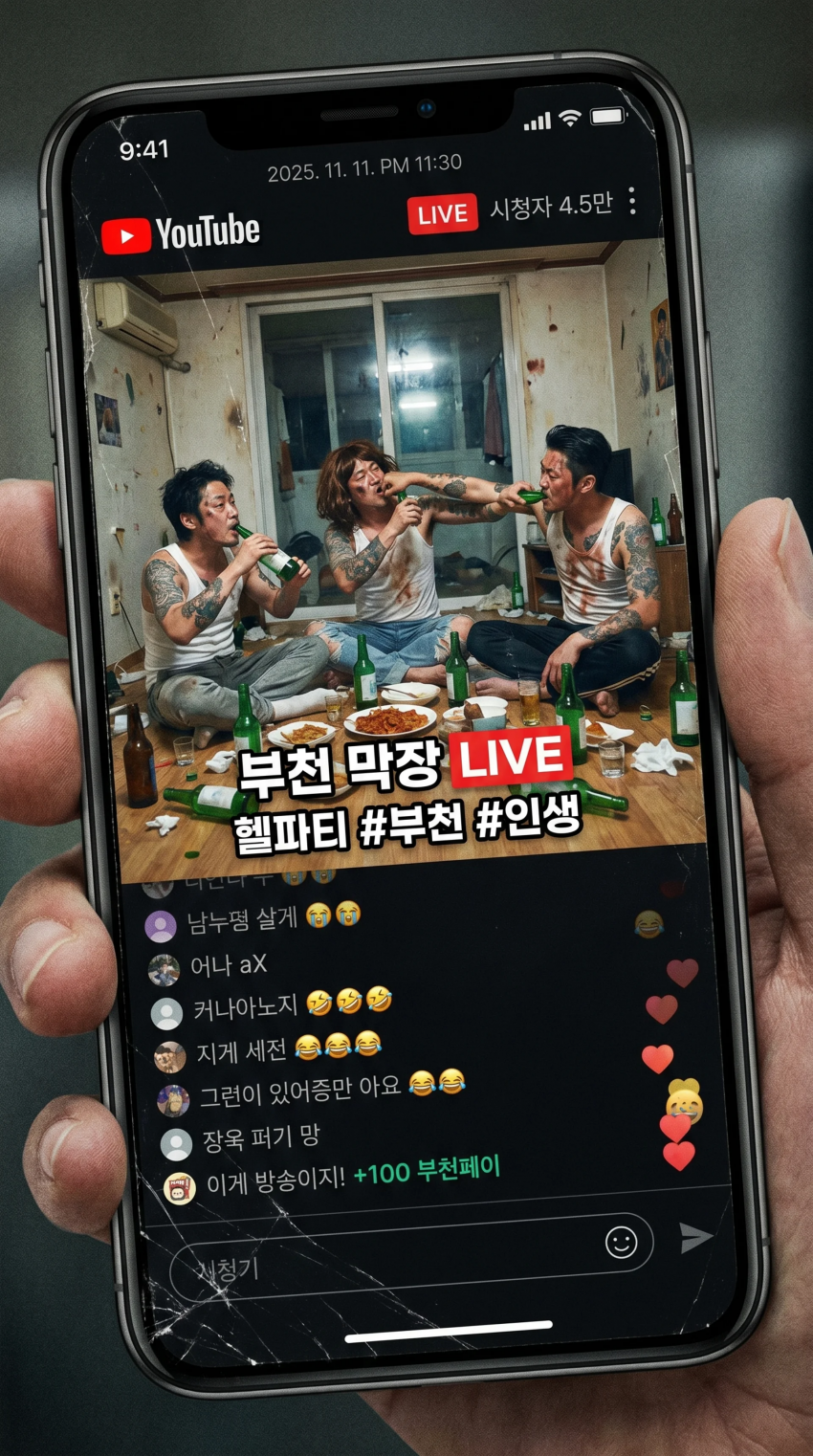 2025년 유튜브 라이브 방송을 진행중인 부천 BJ, 동료 몇명과 막장스러운 방송을 진행 중인 상황 캡쳐한 스크린샷 이미지