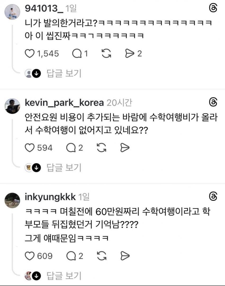 수학여행을 뭐하러가노 가족끼리나 가면 되지 추억은 ㅈㄹ ㅋㅋㅋ