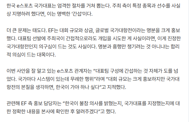 그게 아니라 국가대항전인데 페이커 무조건 데리고와라 이렇게 압박하니깐 케스파가 짱내서 안감 ,우리도 선발전이랑 이런거 거쳐서 뽑아야됨 이지랄 하는거. 근데 상금규모가 660억 ㅋㅋㅋ돈이 압도적인데 시발 무조건 가는게 정답인데 자존심이 밥먹여주는것도 아니고 솔직히 롤=페이커, 사우디애들도 페이커팬이라 티원 후원해주고 그랫잔어. 한국애들만 페이커 개무시하지