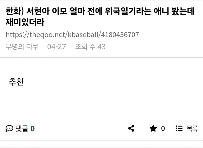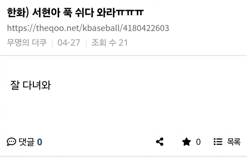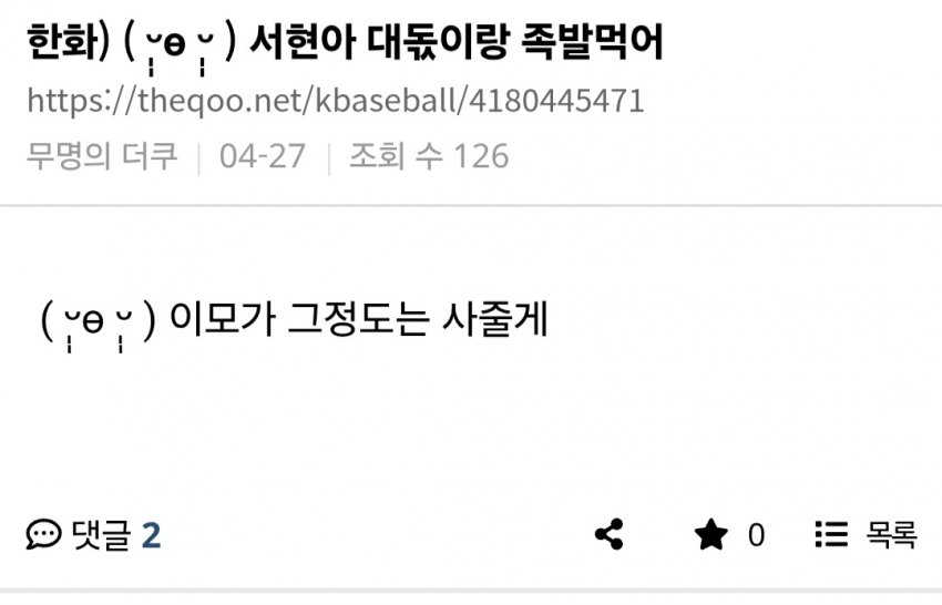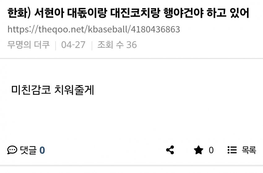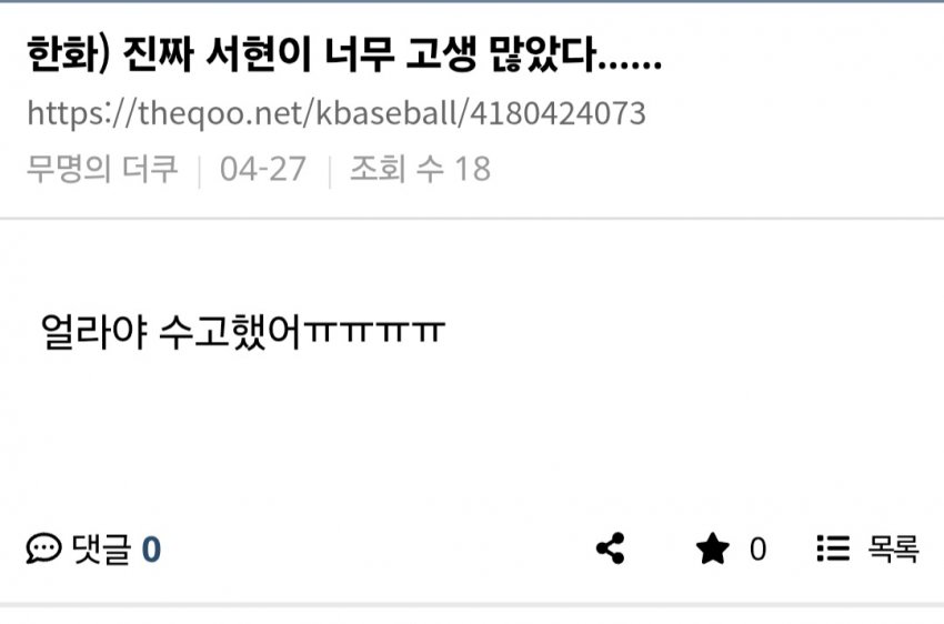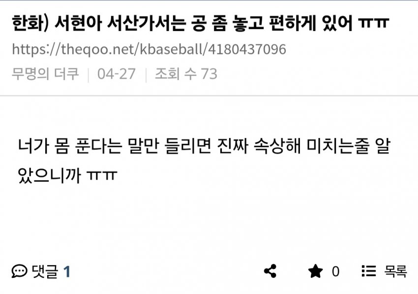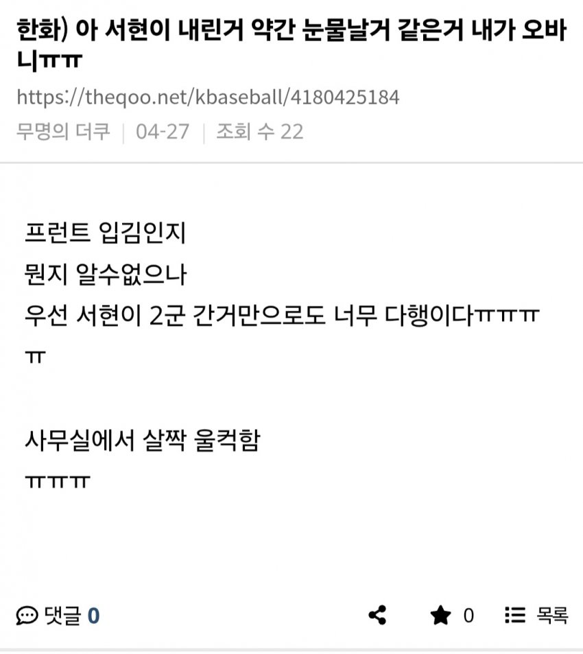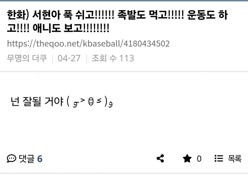 울 서현이 아파하는 모습보니 내가 더 아프네 ㅠㅠ 2군갔다고 기죽지 말고 야구는 재능 없으니 계약금 두둑히 받은걸로 족발집 차려서 너 좋아하는 족발 평생 먹고 볼파크나 대전근처에는 얼씬도 안하길 바래 ㅠㅠ 서현쿤 화이팅!