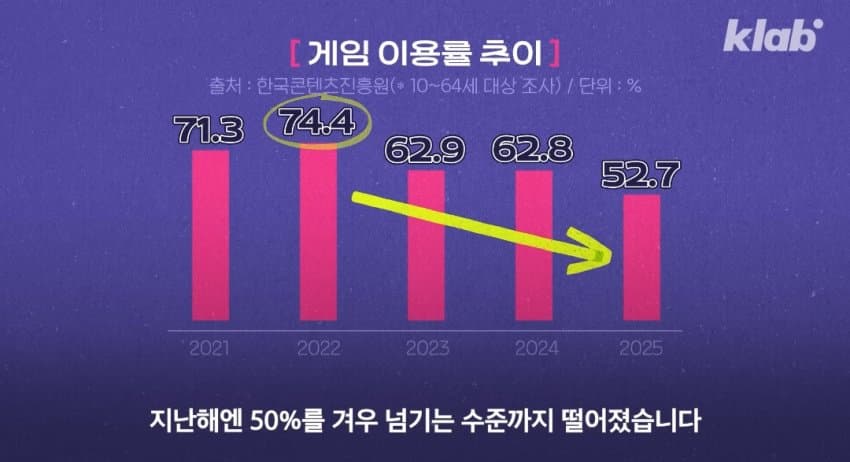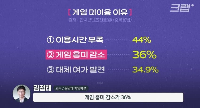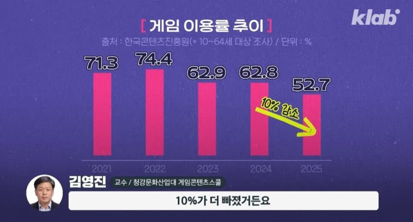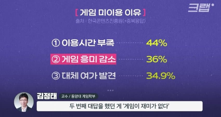 애초에 결혼하고 가정 충실하다보면 자연스럽게 게임은 떨어져나가는게 맞고요새 0010 애들은 컴퓨터보다는 폰에 익숙하다보니까 유튜브에 경쟁자를 뺏기는거고