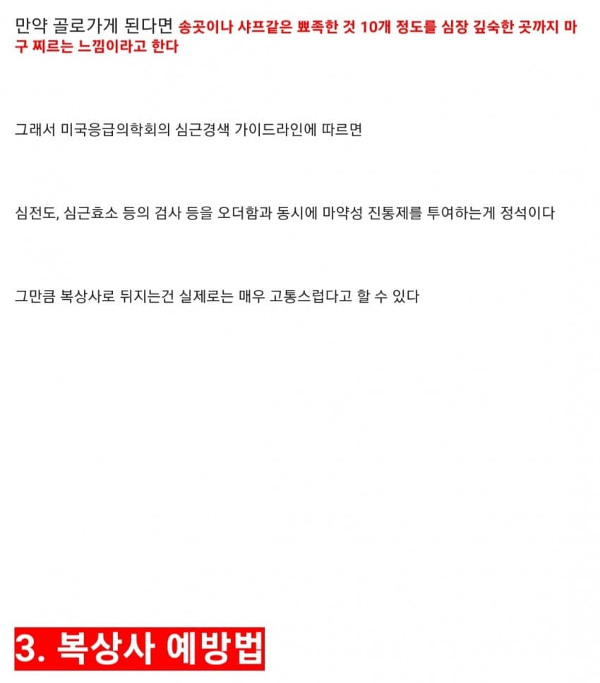 심장마비가 고통스럽긴한데 죽는데까지 걸리는 시간이 제일 짧아서 그나마 편한죽음이래 노인네들 자다가 사망하는게 심장마비 폐쇄성폐질환이 제일 고통스럽게 죽어 숨은 잘땐도 쉬어야하는데 그때도 아프거든