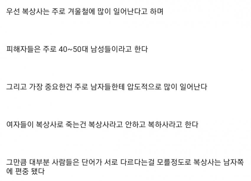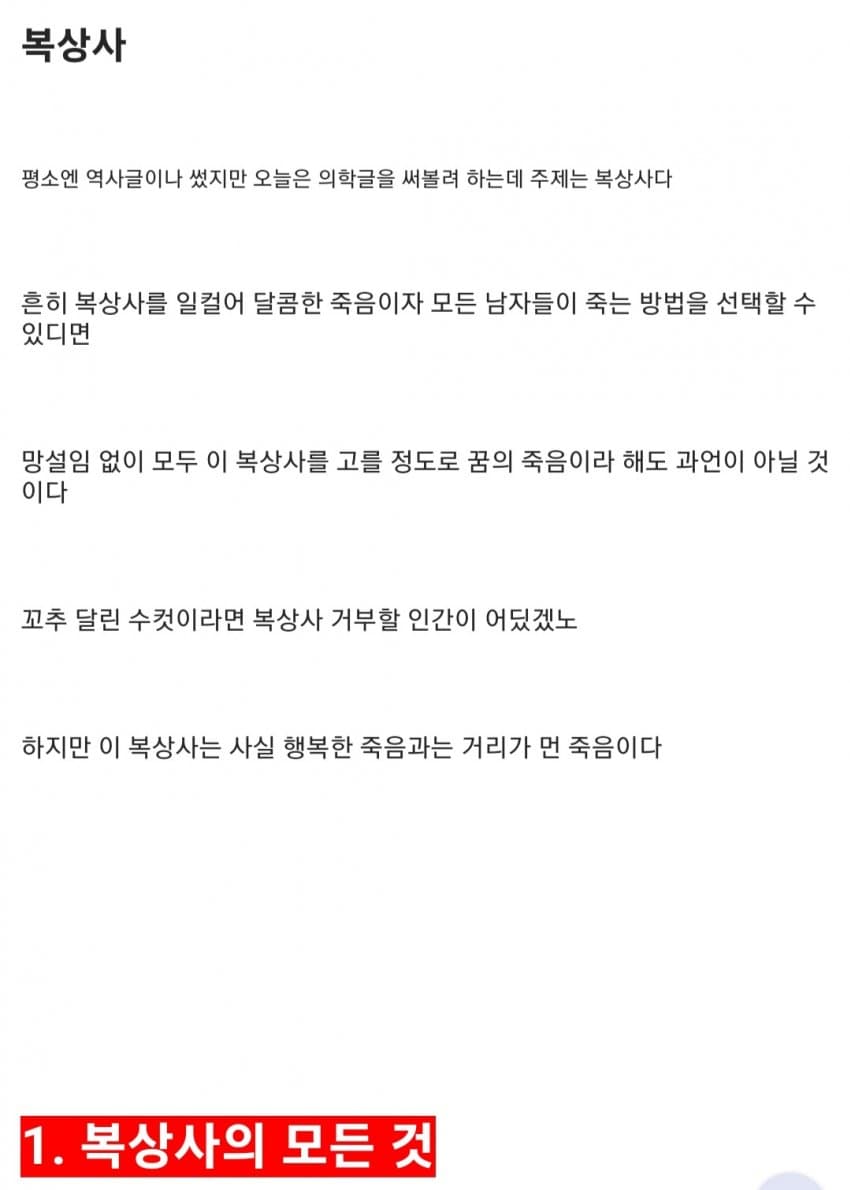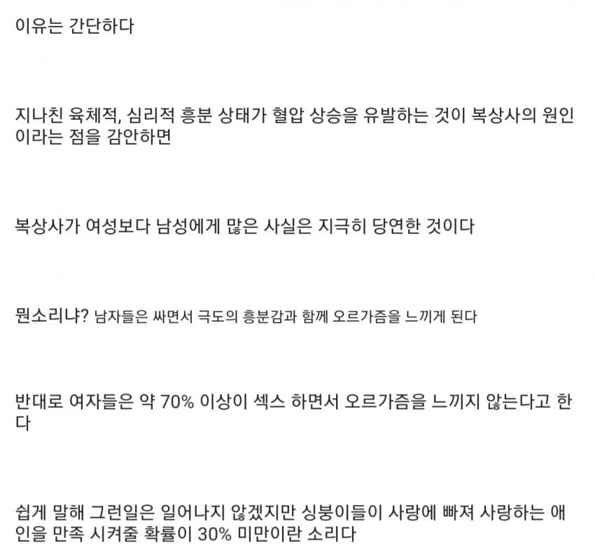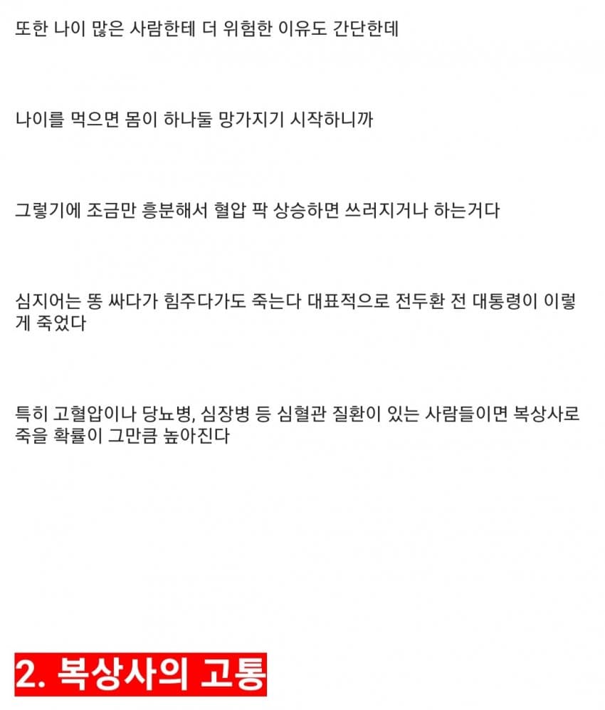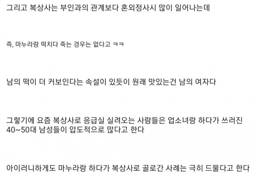 즉 대부분의 복상사가 이미지와는 달리 고혈압 있는 중늙은이들이 업소가서 약처먹은 상태에서 술처먹고 얼굴 시뻘게져서 쒸익쒸익거리다 억 하고 뒤지는 형태로 일어난다는 거군