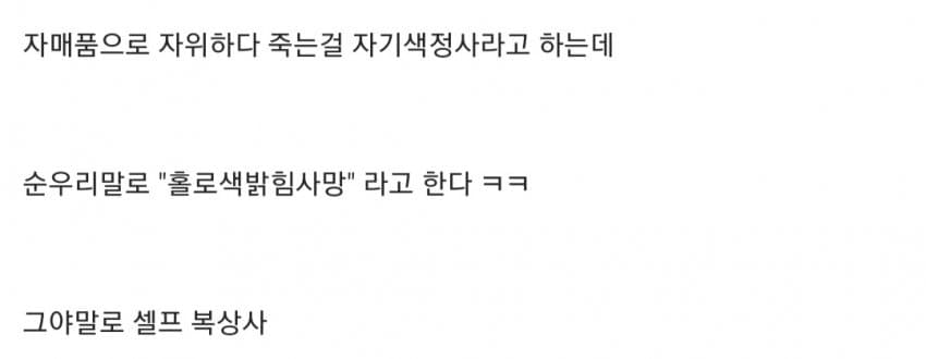 자기색정사는 복상사로 죽는게 아니라 지가 목조르거나 뭘 뒤집어 쓴다거나 해서 모종의 이유로 호흡 안돼서 질식사하는거잖어