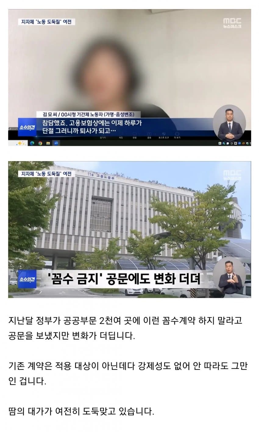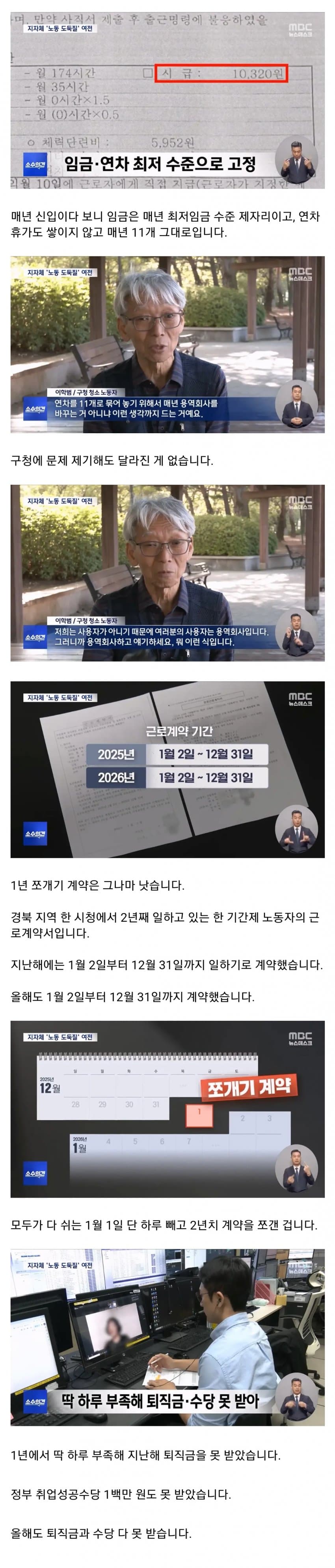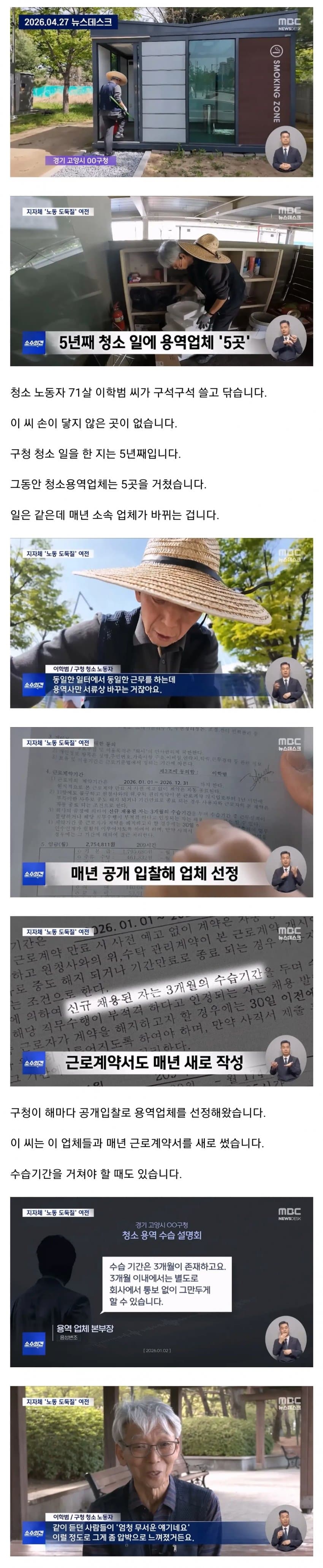 이거 관련해서 내가 정확히 알고있다. 문재인 이후로 공공기간에서 2년이상 일해버리면 직고용 해야함. 근데 인터뷰 한 늙은이 나이가 70살이지? 애초에 노인일자리 계약 말고는 아예 고용할수도 없는 나이임. 구청에서 오랫동안 얼굴 봐온 사이니까 계약 계약 연장해준건데 통수치고 인터뷰 한거다. 저건 노인네가 치매걸려서 미친 짓거리 한거고, 이게 뉴스 탔으니까 모든 지자체에 공문 전파되서 이런 식으로 계약 이어온 사람들 계약해지하라고 "권고" 날아올거임. 그럼 재계약을 아예 안해주는 식으로 결말이 날거다