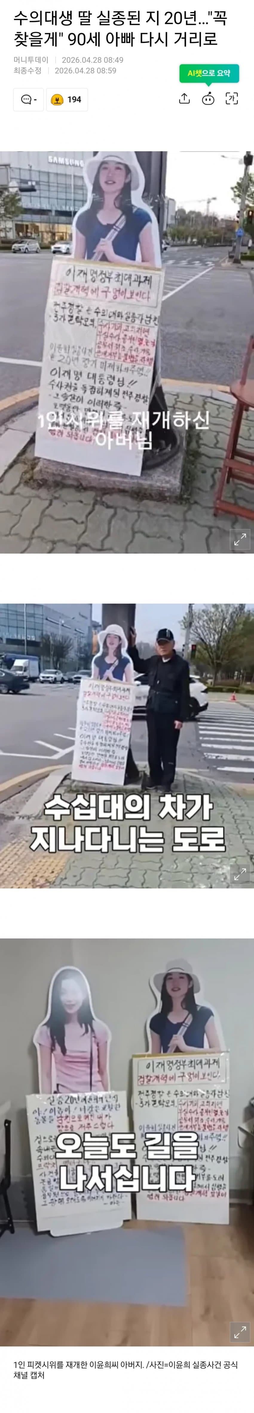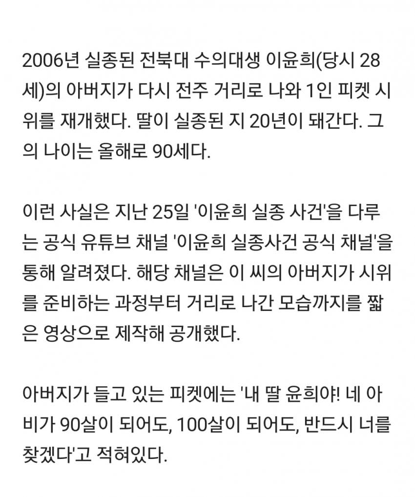 수의대생 딸 실종된지 20년... 90세 아빠가 거리로 나섰다