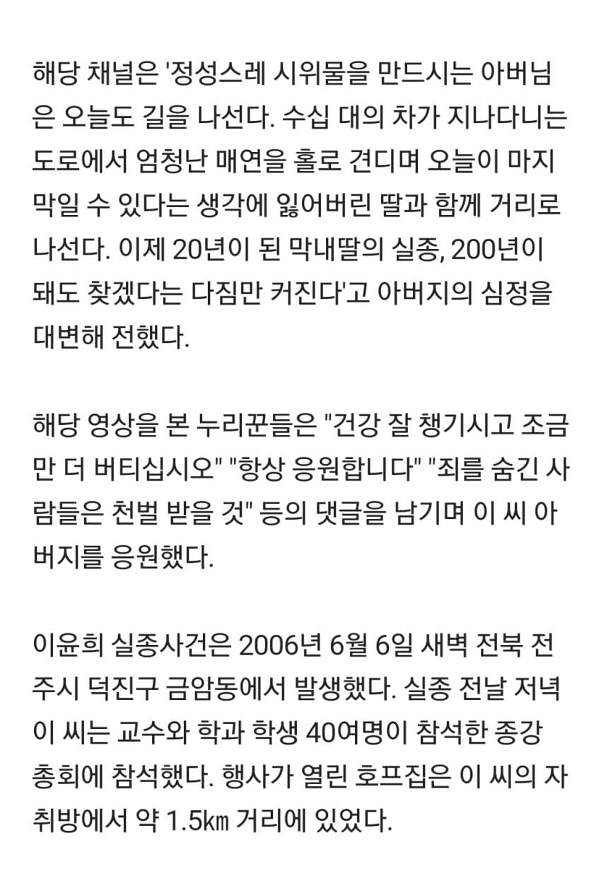 근데 20년전에 대학생 딸 실종에 현재 90세면 대학생 딸 두신 아버님이 나이가 70이었다는거임?그럼 50세에 가지신건가?
