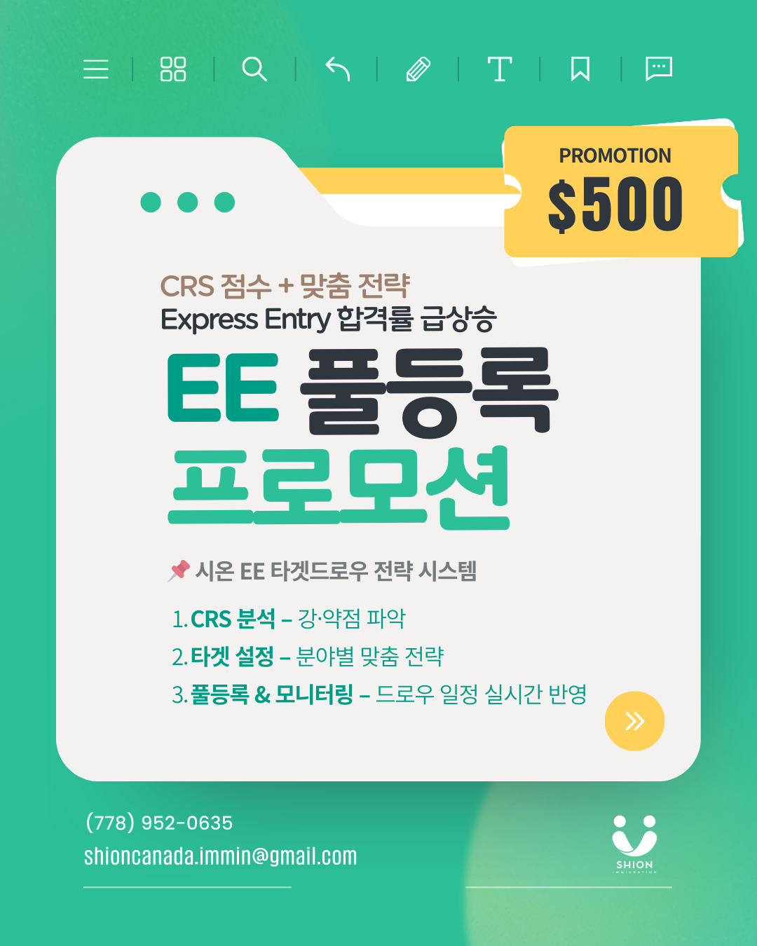 궁금한 점이 있다면 778-952-0635 번호로 전화나 문자를 날려보시거나 shioncanada.immin@gmail.com 이메일로 연락을 취해 보시기 바랍니다. 인생의 중요한 순간을 함께 걸어가 주겠다고 하니 어서 연락해서 영주권의 꿈을 실현해 보시는 것이 좋겠습니다.