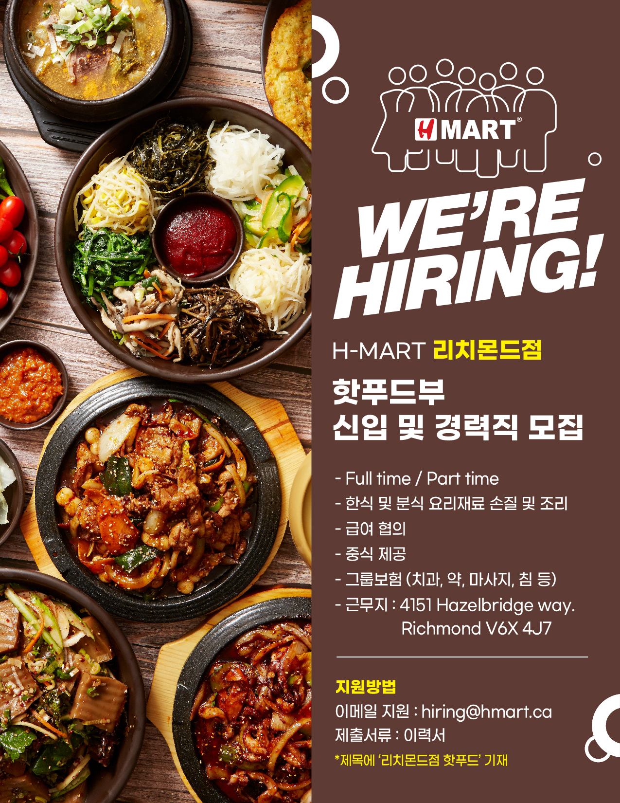 관심 있으신 분들은 hiring@hmart.ca 이메일로 이력서 보내시면 됩니다. 제목에 반드시 “리치몬드점 무슨무슨부” 라고 적어주시는 센스가 필요하다고 하네요. 사전 질문지도 작성해야 한다고 하니 꼼꼼하게 챙겨서 지원해보시길 바랍니다.