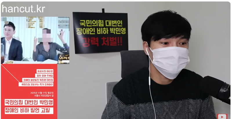 국민의힘 박민영 대변인이 김예지 의원한테 완전 선 넘는 발언을 했다는 거 아니겠어? “배려받는 걸 당연하게 생각한다”, “피해의식 똘똘 뭉쳤다” 뭐 이런 말을 했다는 거야. 심지어 유튜브 방송에선 진행자가 김 의원한테 막말 퍼부을 때 옆에서 웃으며 호응까지 했다고. 진짜 어이가 없어서 말이 안 나옴.