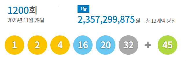 이번 1200회 로또 추첨 결과가 드디어 나왔어. 당첨 번호는 1, 2, 4, 16, 20, 32이고 보너스 번호는 45래.