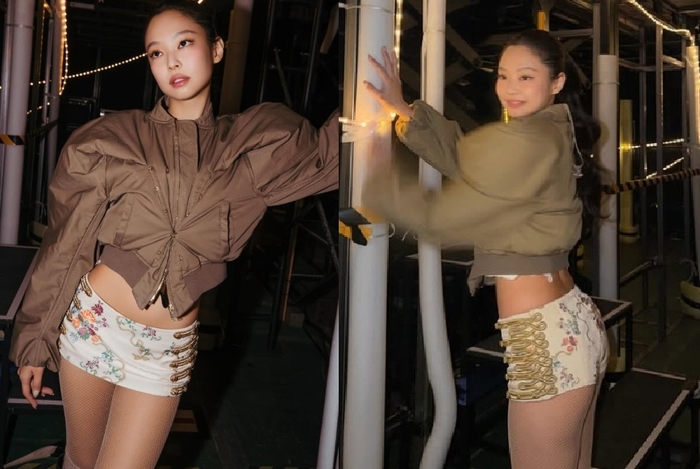 처음에 정면 사진만 딱 봤을 때는 그냥 평범하게 예쁜 미니스커트인가 보다 했거든. 근데 슬쩍 공개된 뒷모습을 보니까 세상에나 반바지로 된 반전 패션이지 뭐야. 빡센 안무 소화해야 하는 아이돌한테는 활동성까지 챙기면서 간지까지 챙긴 그야말로 갓벽한 코디라고 할 수 있지. 디자인 자체가 앞뒤가 아예 달라서 묘한 매력이 있는데 이걸 또 제니가 찰떡같이 소화하니까 그냥 그대로 런웨이 올려도 될 수준이야. 일명 “앞치뒤반” 패션인데 이거 조만간 홍대나 성수동 길거리에서 유행할 것 같은 예감이 강하게 들어.
