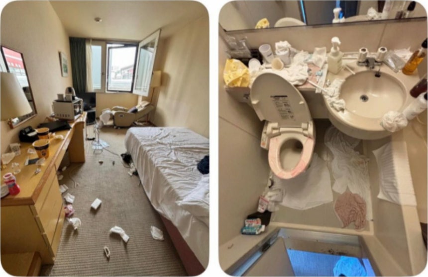 일본 삿포로 게스트하우스에서 역대급 빌런이 탄생했어. 중국인 여성 관광객 둘이 묵고 간 방이 거의 “종말 이후의 세계”마냥 초토화됐더라고. 공개된 사진 보니까 이건 뭐 사람이 살던 곳인가 싶을 정도로 쓰레기 산을 쌓아놨어. 수건이랑 휴지는 사방팔방 굴러다니고, 특히 변기가 무슨 호러 영화 촬영장마냥 시뻘겋게 물들어 있는 게 진짜 소름 돋는 포인트임. 이 정도면 청소가 아니라 퇴마가 필요한 수준 아니냐고.