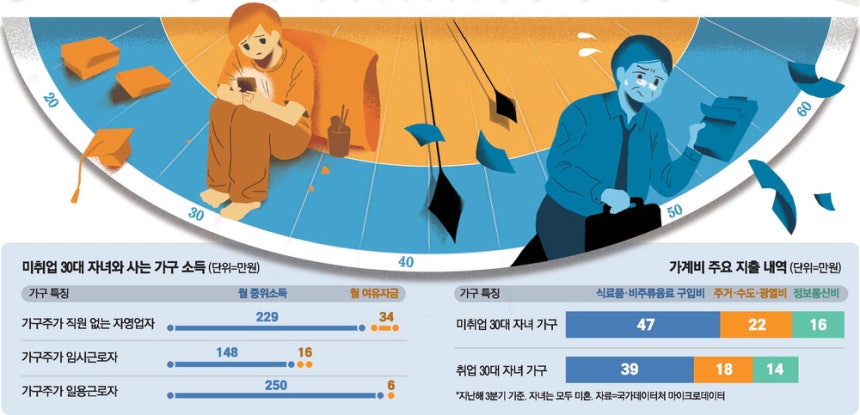 특히 부모님이 자영업 하시거나 일용직으로 일하시는 집은 상황이 진짜 에바야. 생활비 다 떼고 나면 한 달에 남는 돈이 고작 6만 원에서 16만 원 수준이라는데, 이건 뭐 저축은커녕 아프기라도 하면 바로 비상사태 터지는 수준인 거지. 부모님은 은퇴하고 편히 쉬고 싶어도 백수 자식 입에 들어갈 밥값 버느라 억지로 몸을 갈아 넣고 있는 셈이야.