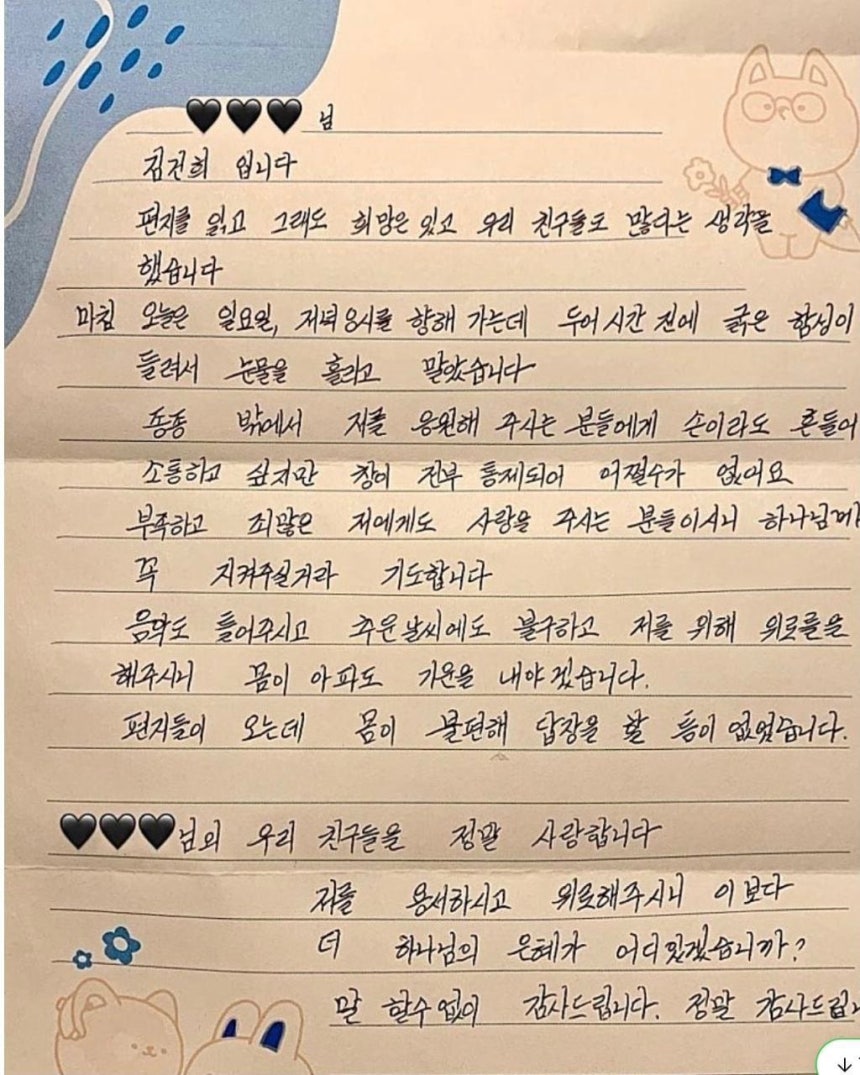 죄 많은 본인에게 이렇게까지 사랑을 주시니 하나님 은혜가 끝도 없다며 무한 감사를 시전 중이다. 몸이 좀 아프긴 해도 위로받으니까 기운 내야겠다고 다짐하는 모습이 거의 팬클럽 정모 분위기야. 이 편지가 지금 유튜브랑 페이스북에서 짤로 돌아다니면서 아주 화제가 되고 있는데 지지자들은 벌써 눈물바다가 됐다는 후문이다.