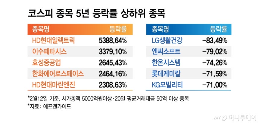 주식 시장에서 5년이라는 세월이 흐르고 나니 누군가는 강남 아파트로 가고 누군가는 한강 다리 구경하게 생겼네. 코스피 시장 종목들을 살펴보니 HD현대일렉트릭이라는 종목이 5년 만에 수익률 5388퍼센트라는 경이로운 기록을 세웠어. 5년 전에 1000만 원 넣어두고 주식 앱 삭제했다가 오늘 다시 깔았으면 통장에 5억 4800만 원이 찍혀 있다는 소리야. 이건 뭐 로또 1등 당첨이랑 맞먹는 화끈한 수익률이지.