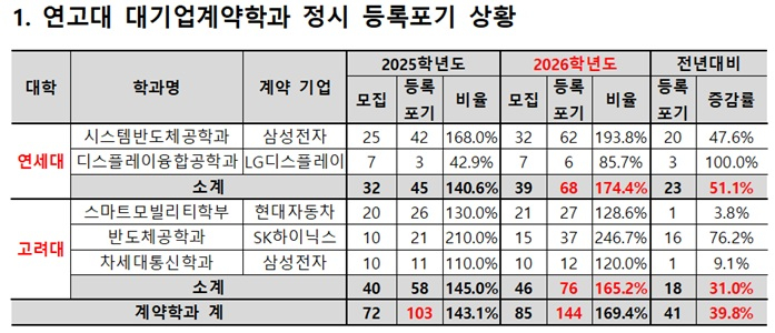 요즘 상위권 수험생들 사이에서 삼전이나 하이닉스 들어가는 프리패스 티켓을 쿨하게 버리는 게 유행인가 봄. 연세대랑 고려대에 있는 대기업 취업 보장 계약학과 합격하고도 나 안 가요 시전하고 탈주한 인원이 무려 144명임. 작년보다 40퍼센트나 늘었는데, 모집 정원보다 도망간 사람이 더 많은 기현상이 벌어지고 있어.