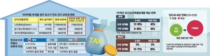 지금 우리나라 보유세가 0.1퍼센트 수준인데 선진국처럼 1퍼센트대로 올리겠다는 소리가 나오고 있어. 뉴욕식으로 가면 60억짜리 아파트 세금이 일 년에 6천만 원이라는데 이건 뭐 웬만한 직장인 연봉이 그대로 증발하는 수준이지. 원베일리 같은 곳은 지금보다 세금이 4배나 뛴다니 그야말로 후덜덜한 상황이야. 일본이나 프랑스처럼 고가 주택에 부유세까지 때려버리면 진짜 숨 쉴 틈도 없을 것 같아.