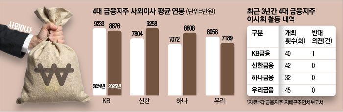 연봉 8500만 원 받고 하는 일은 그냥 이사회 나가서 찬성 버튼 클릭 한 번 하는 게 전부인 신의 직장이 실존한다는 소식임. KB, 신한, 하나, 우리금융 같은 4대 금융지주 사외이사들 얘긴데, 작년에 이사회 51번 열리는 동안 안건 155건 중에서 반대는 딱 한 표 나왔다고 함. 사실상 경영진이 시키는 대로 네네 하는 거수기 노릇만 야무지게 하는 셈이지.