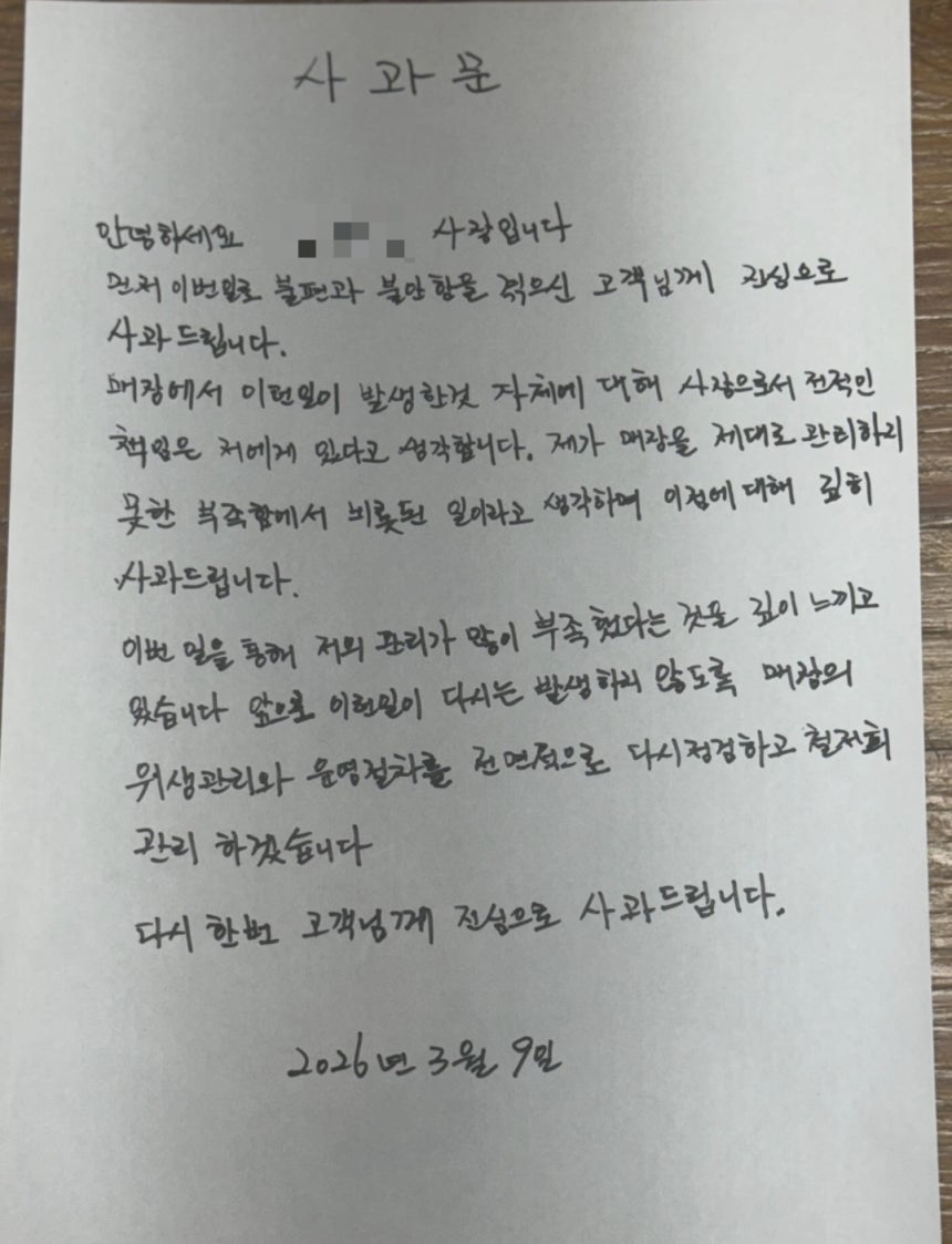구청에서 점검 나오고 일이 커지니까 그제야 사장이 SNS에 공식 사과문을 올렸더라고. 매장 관리 못한 본인 책임이라며 앞으로 위생 교육 철저히 하겠다고 고개를 숙였는데, 이미 소 잃고 외양간 고치는 격이지. 먹는 음식에 락스가 섞여 나오는 것도 어질어질한데 직원의 뻔뻔한 대응까지 더해지니 커뮤니티 민심은 이미 나락으로 가버렸어.
